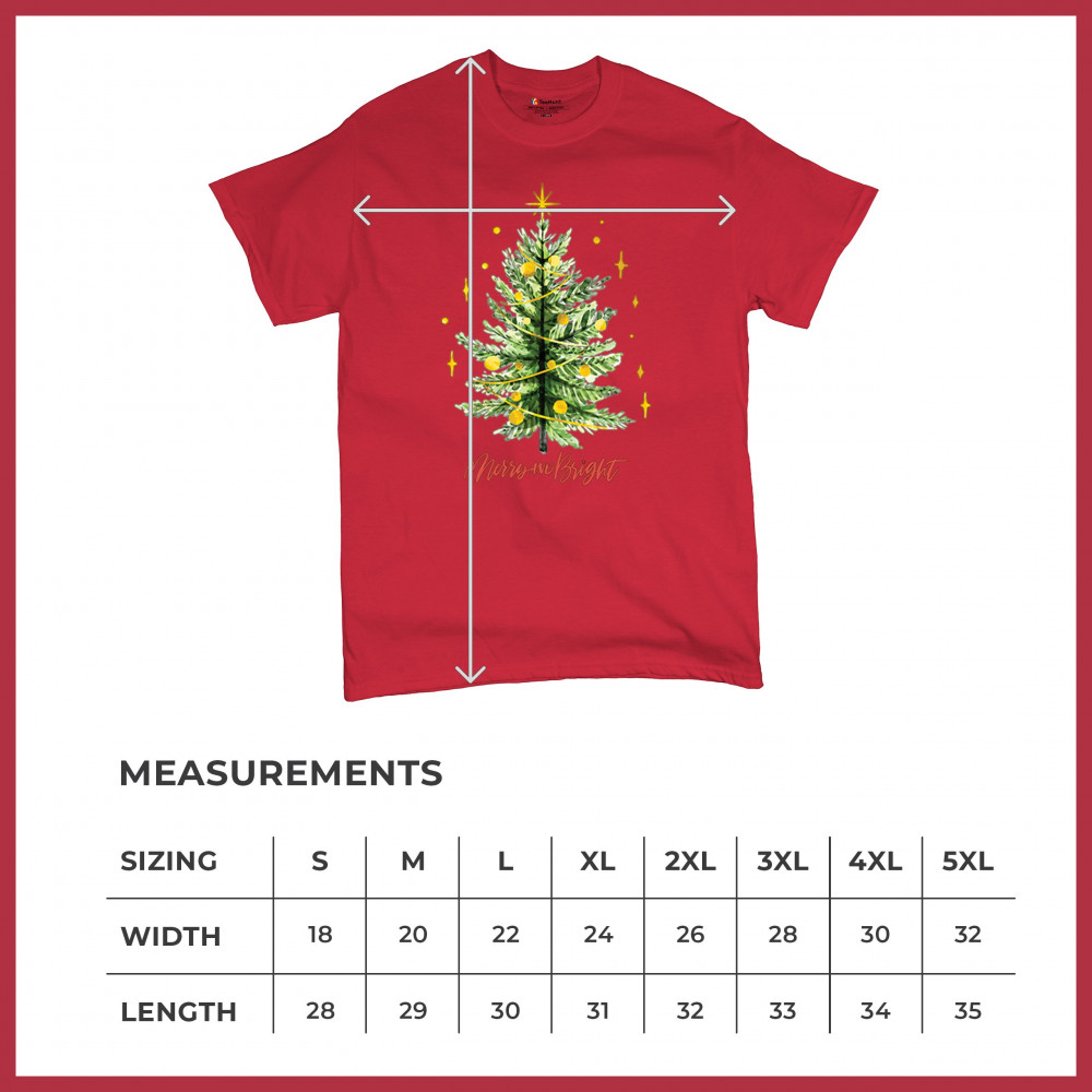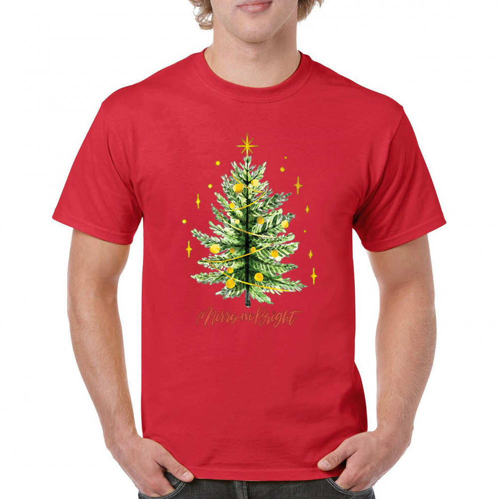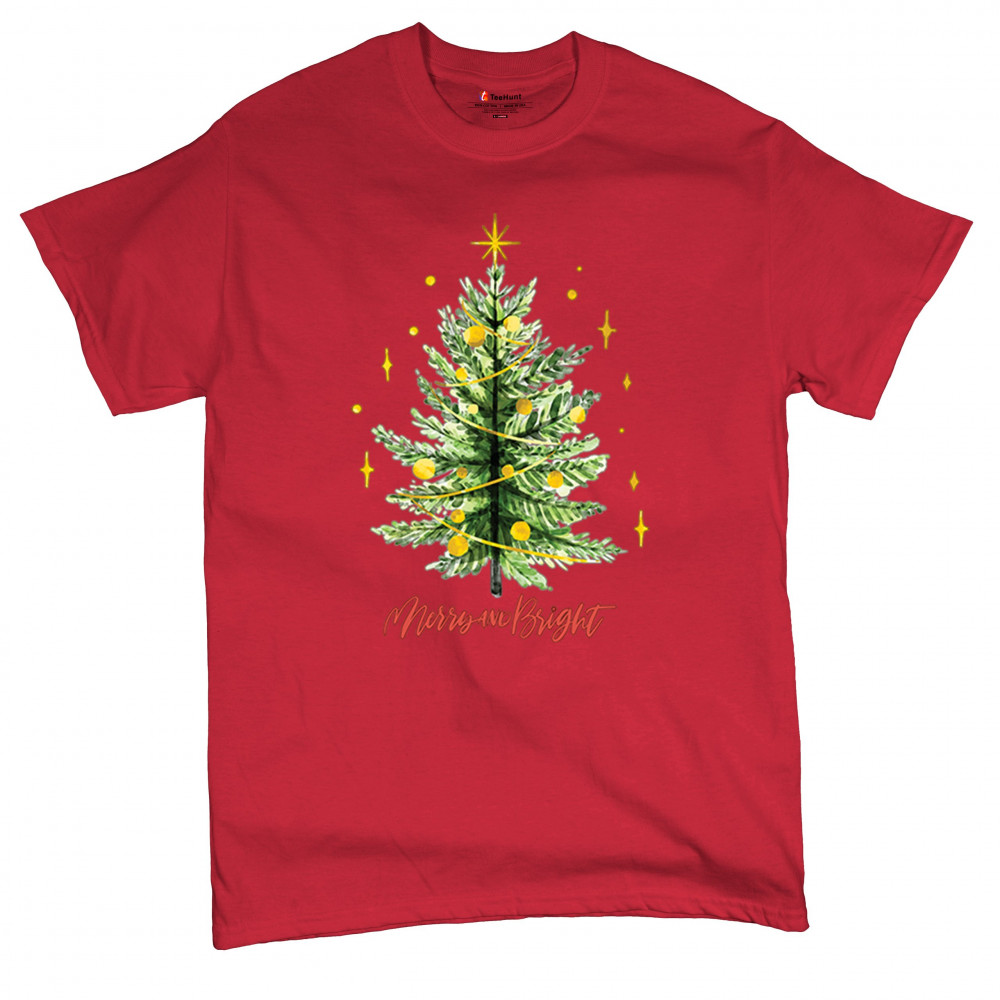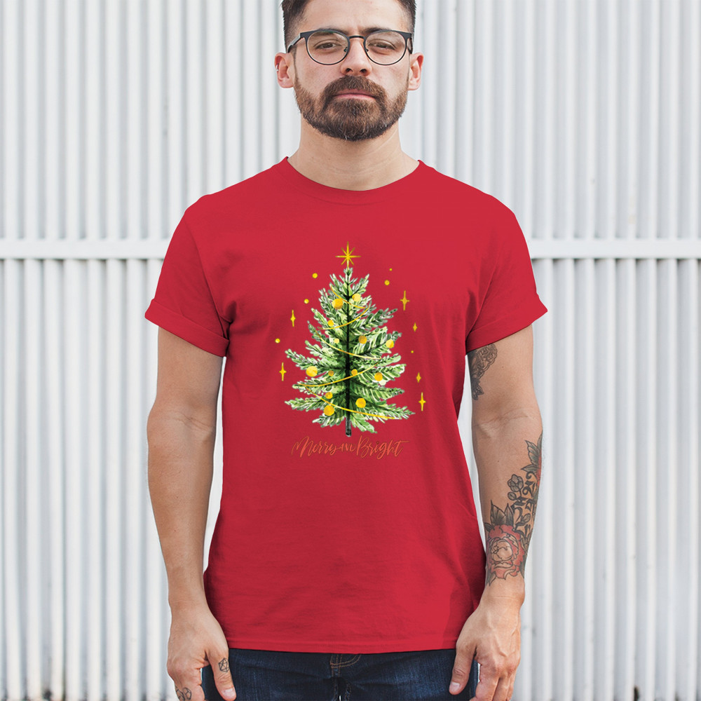 Festive “Merry and Bright†shirt featuring a joyful Christmas tree. Perfect for holiday gatherings, office parties, or Secret Santa gifts.
