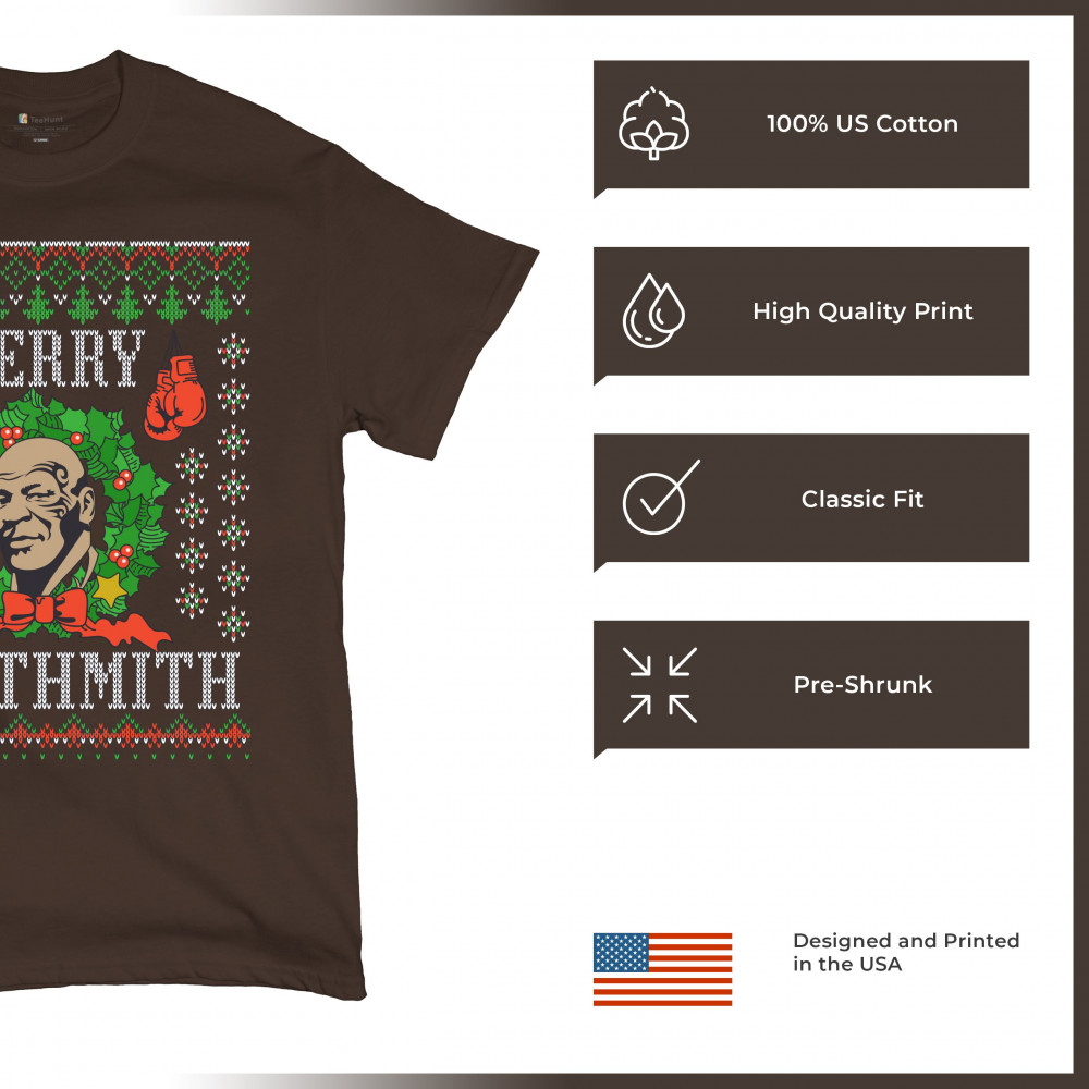 A print saying: "Merry Chrithmith" and featuring the face of Mike Tyson inside of a Christmas chaplet and two pairs of boxing gloves. The print is designed as an ugly sweater. Amazing choice to make people smile and spread positive vibes on Christmas Eve.