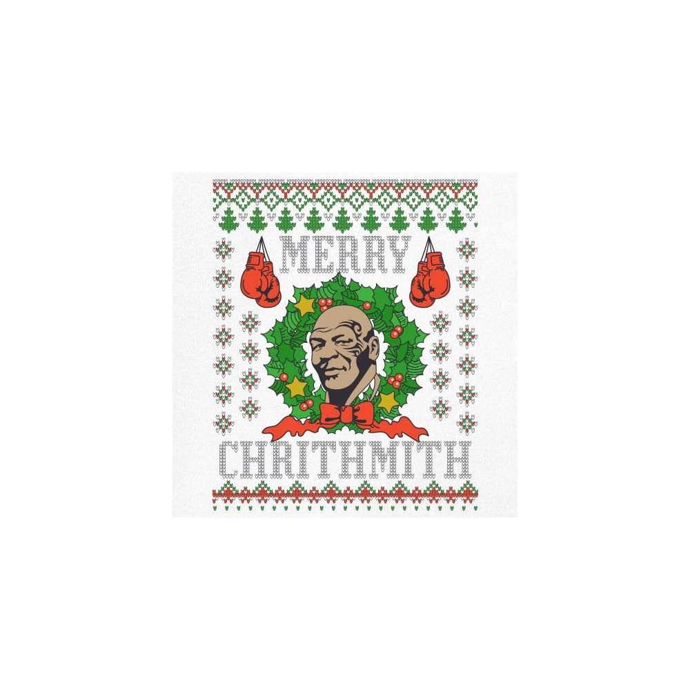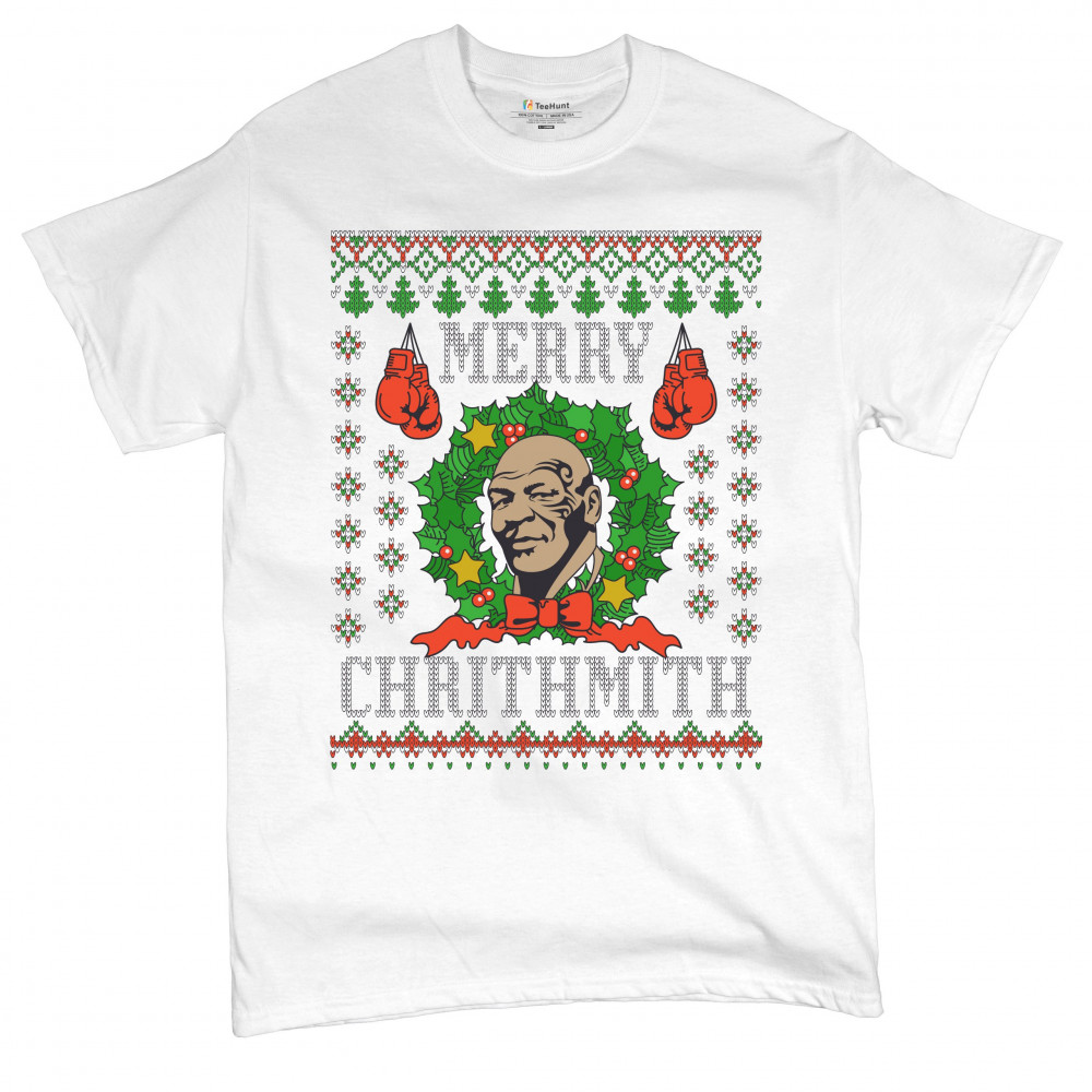 A print saying: "Merry Chrithmith" and featuring the face of Mike Tyson inside of a Christmas chaplet and two pairs of boxing gloves. The print is designed as an ugly sweater. Amazing choice to make people smile and spread positive vibes on Christmas Eve.