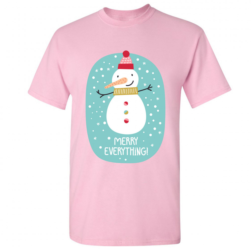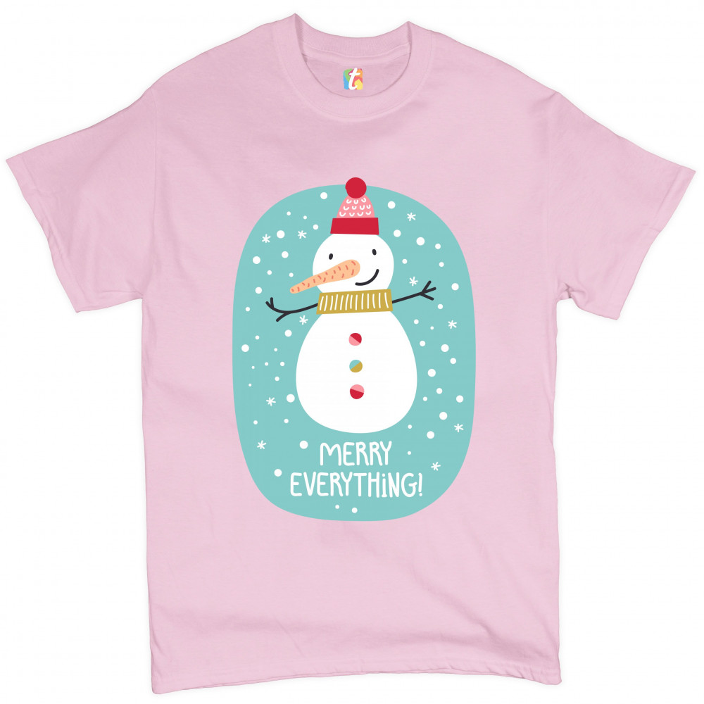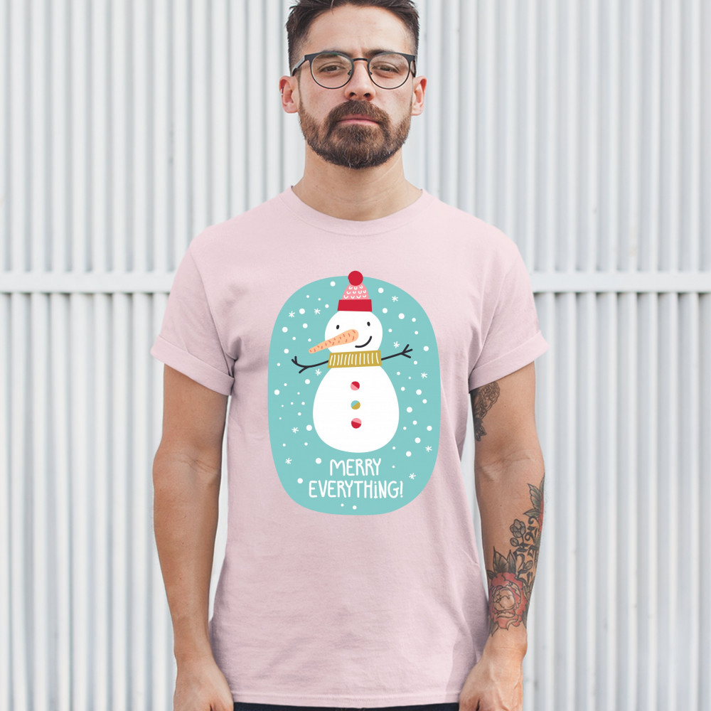 A print featuring a happy snowman with a carrot nose wearing a hat and a scarf smiling and spreading it's hands. It is snowing and below the snowman it says: "Merry Christmas". Amazing choice to make people smile and spread positive vibes on Christmas Eve