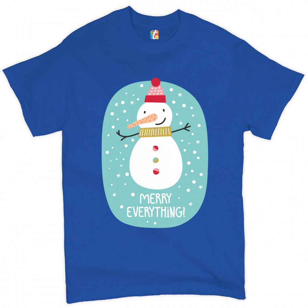 A print featuring a happy snowman with a carrot nose wearing a hat and a scarf smiling and spreading it's hands. It is snowing and below the snowman it says: "Merry Christmas". Amazing choice to make people smile and spread positive vibes on Christmas Eve