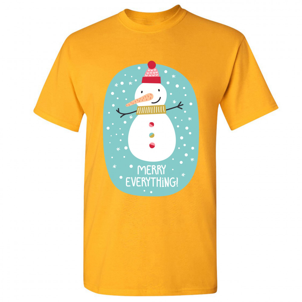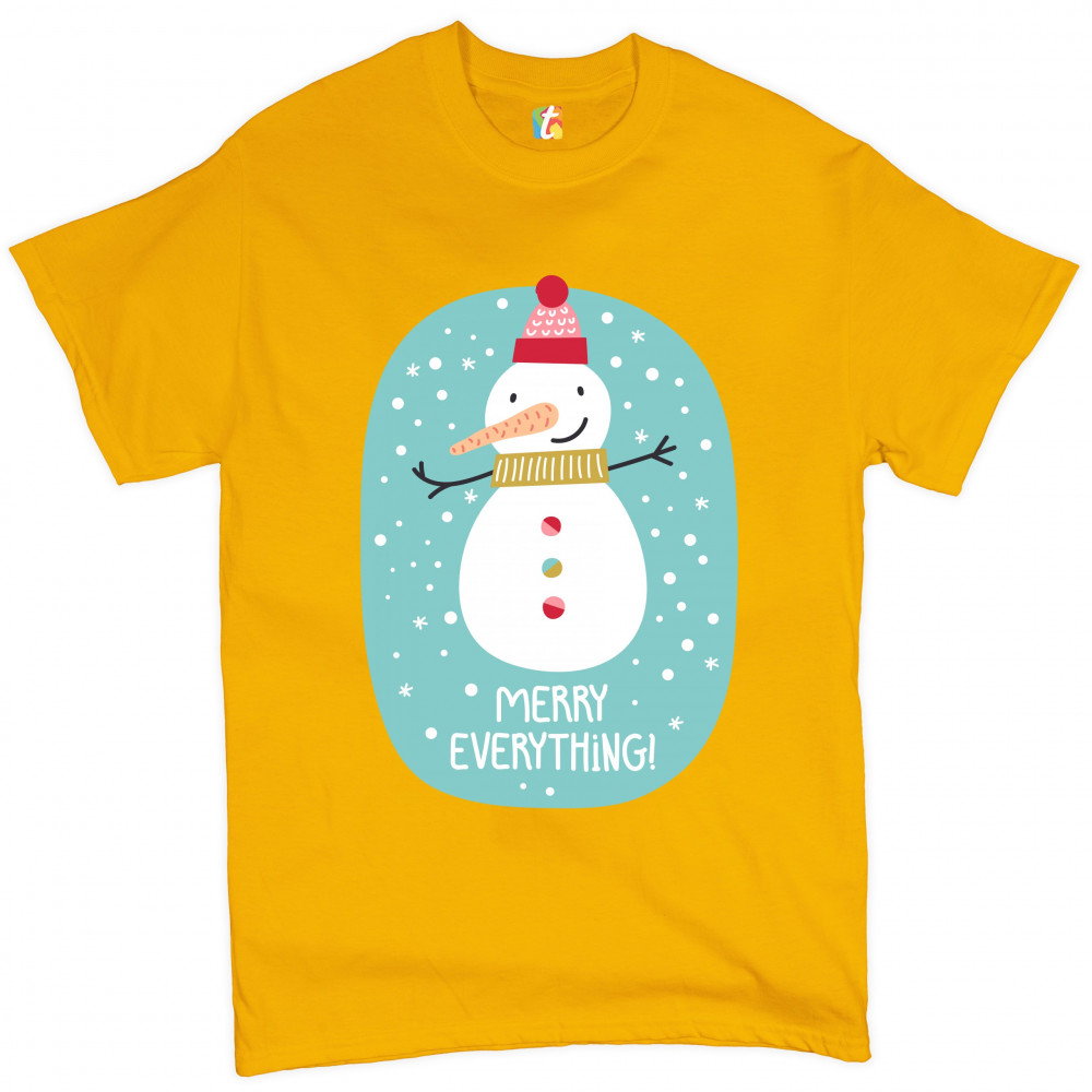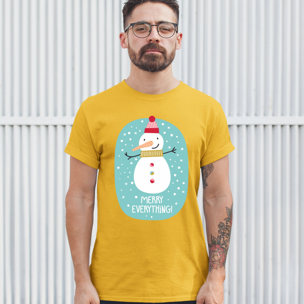 A print featuring a happy snowman with a carrot nose wearing a hat and a scarf smiling and spreading it's hands. It is snowing and below the snowman it says: "Merry Christmas". Amazing choice to make people smile and spread positive vibes on Christmas Eve