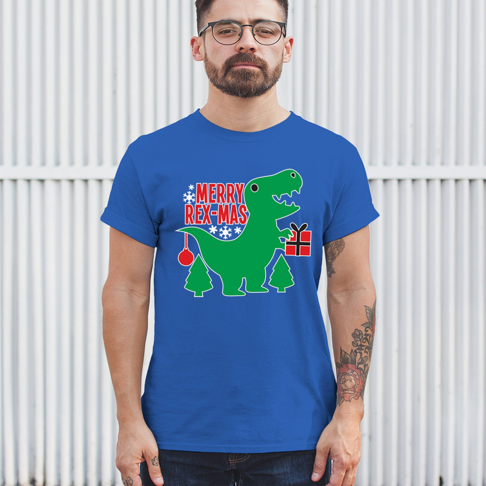 Merry Rex-Mas dinosaur Christmas design with a cute T-Rex, gift, and festive holiday details. Perfect for fun family celebrations and cheerful winter style.