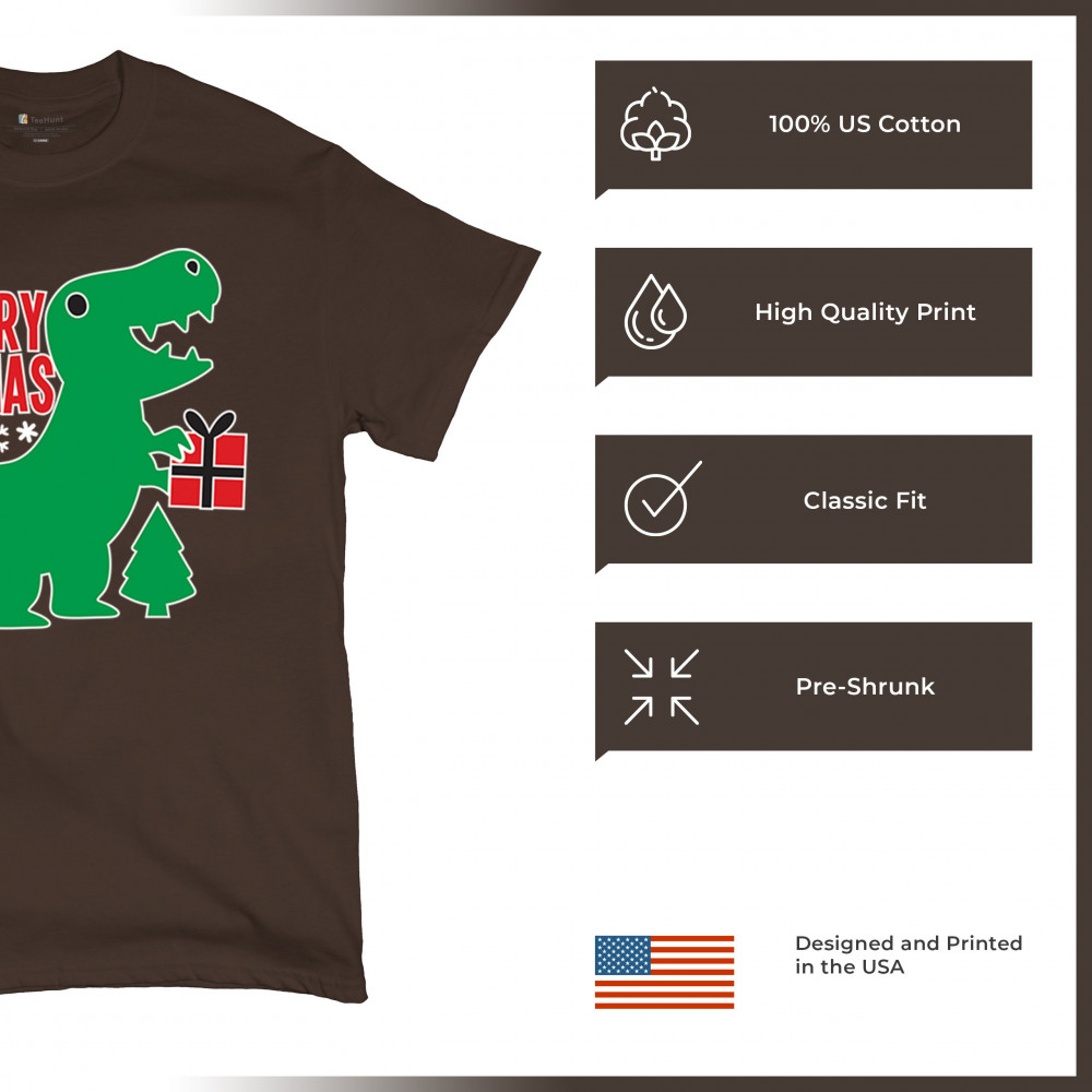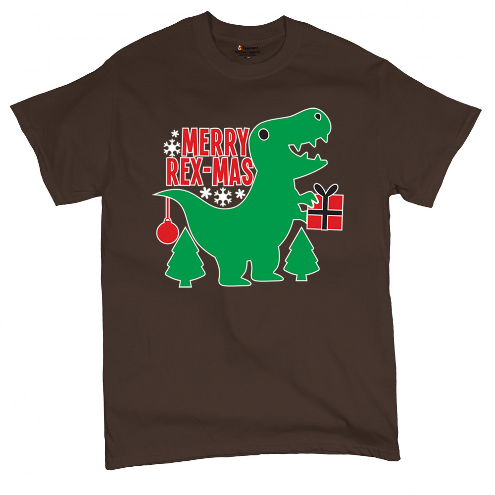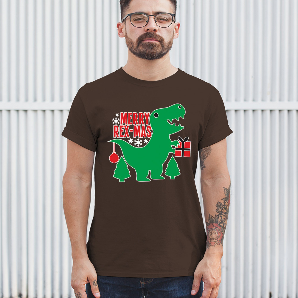 Merry Rex-Mas dinosaur Christmas design with a cute T-Rex, gift, and festive holiday details. Perfect for fun family celebrations and cheerful winter style.