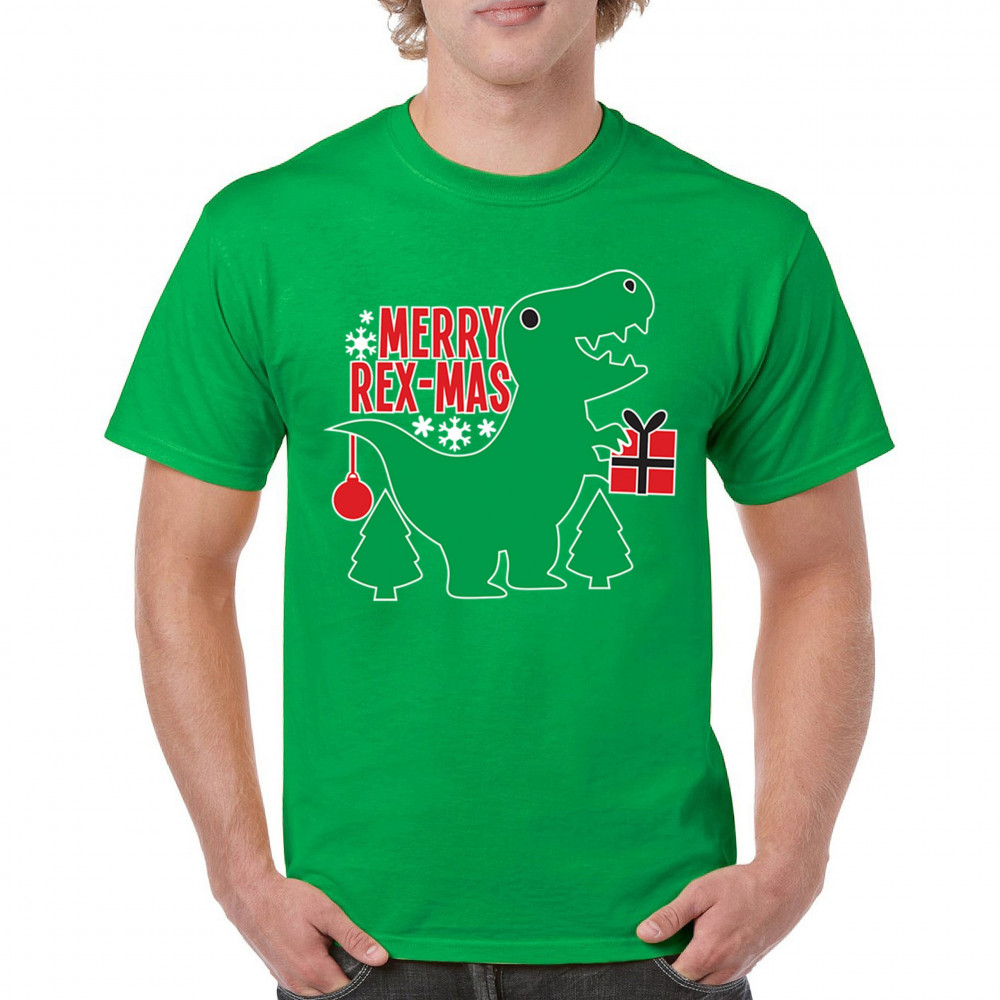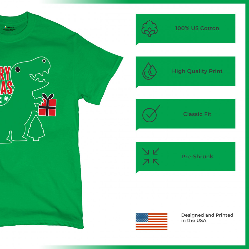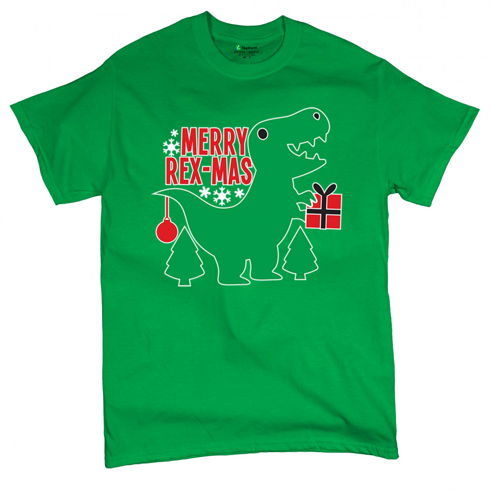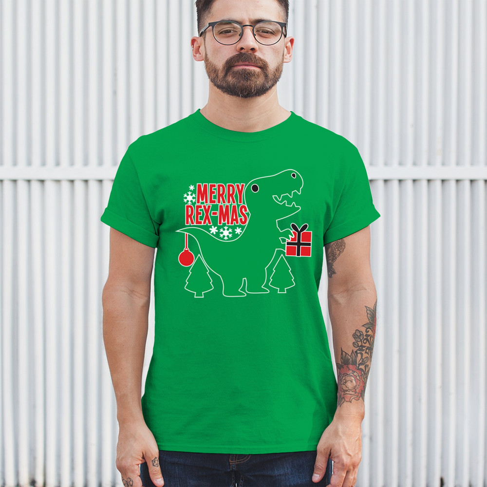Merry Rex-Mas dinosaur Christmas design with a cute T-Rex, gift, and festive holiday details. Perfect for fun family celebrations and cheerful winter style.