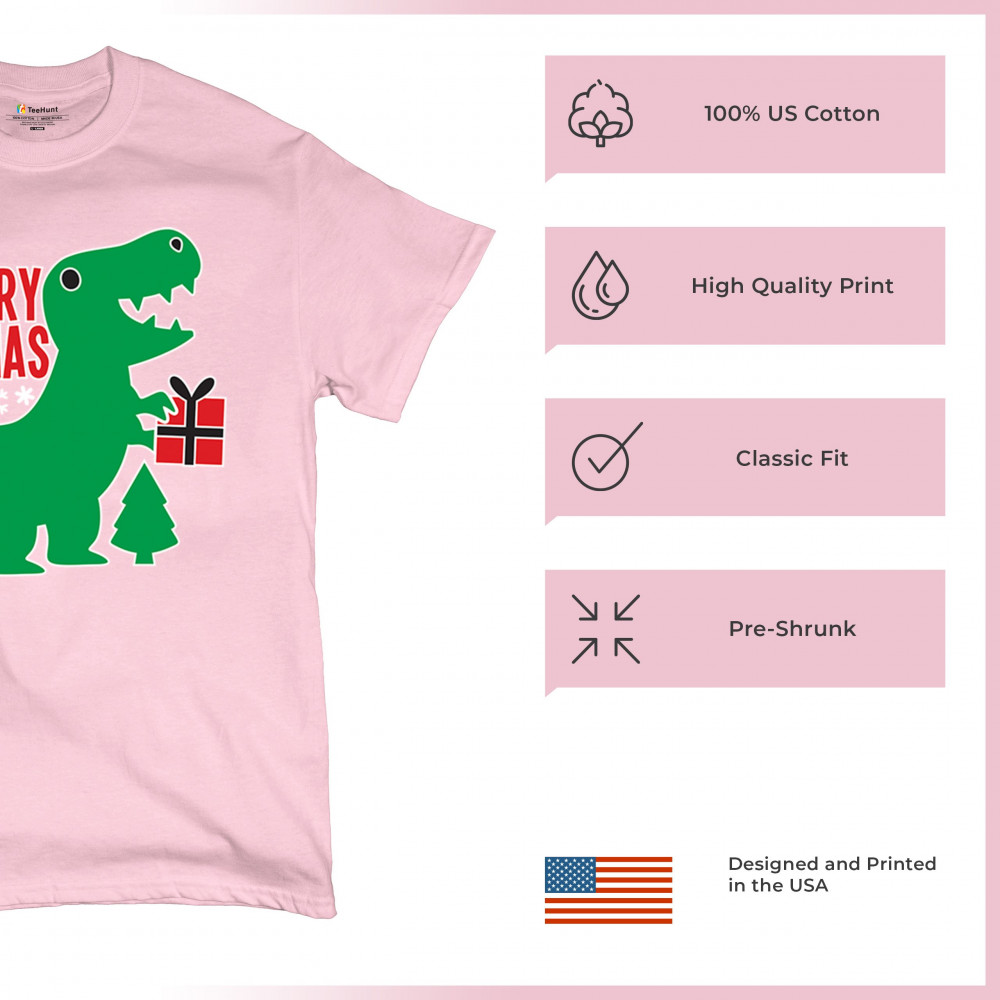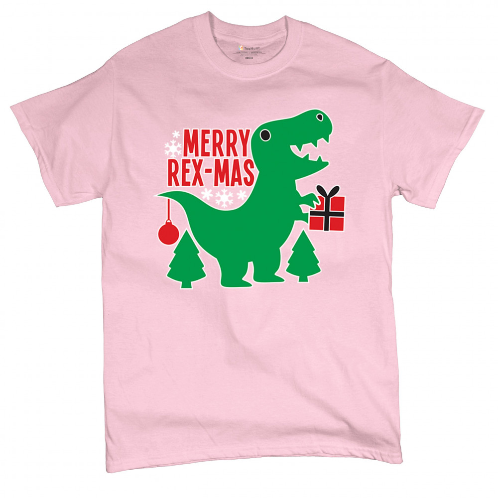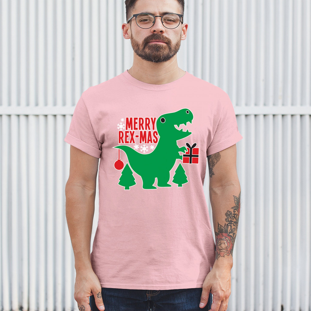 Merry Rex-Mas dinosaur Christmas design with a cute T-Rex, gift, and festive holiday details. Perfect for fun family celebrations and cheerful winter style.
