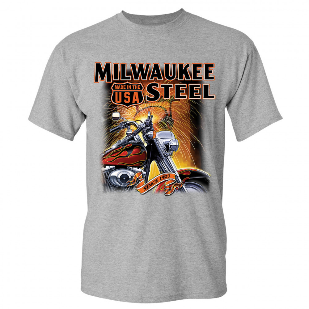 A print featuring a motorcycle in the front and a melting furnace in the background with sparkles flying all over the place. The print says: "Milwaukee Steel". There is also a sign that says "made in the USA" and a stripe with "since 1903" written on it.