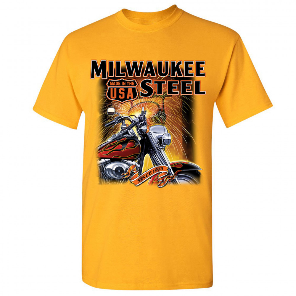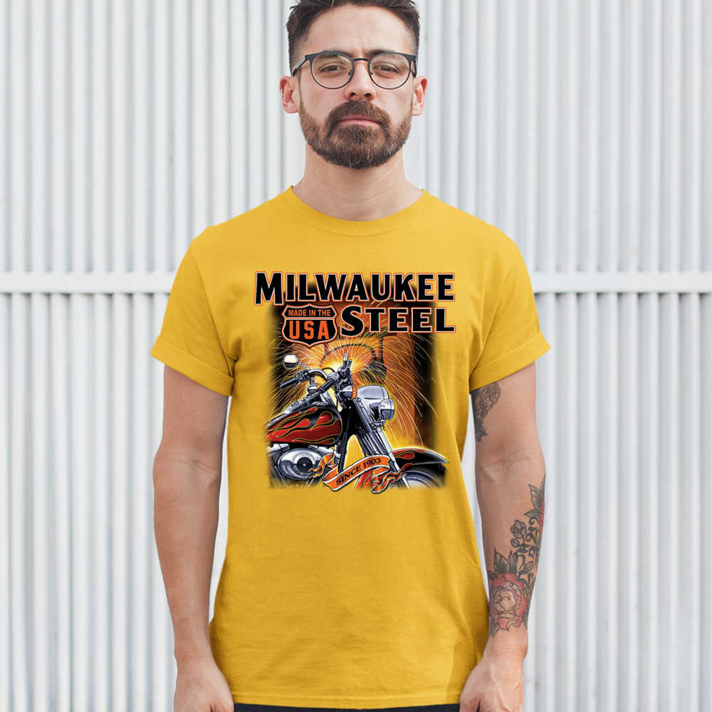 A print featuring a motorcycle in the front and a melting furnace in the background with sparkles flying all over the place. The print says: "Milwaukee Steel". There is also a sign that says "made in the USA" and a stripe with "since 1903" written on it.