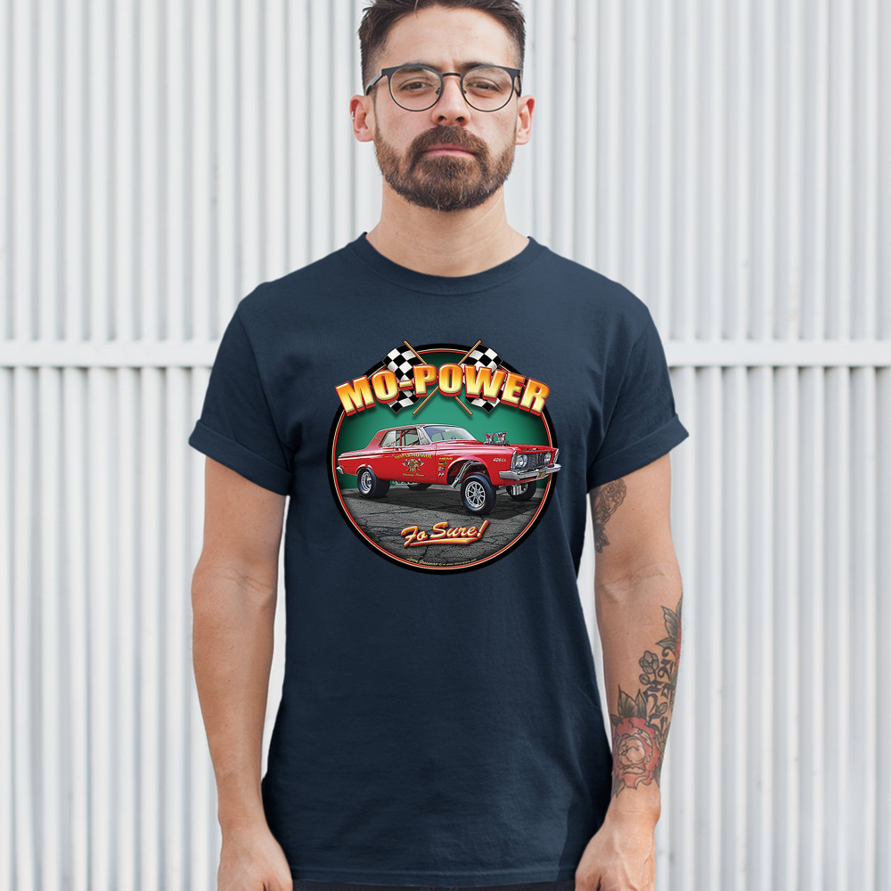 A print featuring a classic muscle car with a gasser. Above the car there are racing flags and the print says: "Mo-Power Fo Sure!". A great choice for Route 66 and hot rod fans.