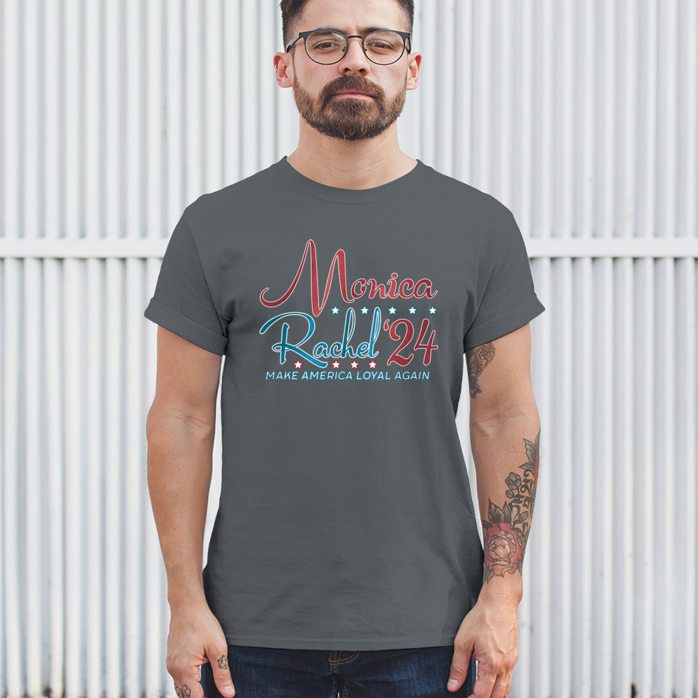 Bring together the nostalgia of "Friends" and the excitement of the upcoming election with this Monica and Rachel '24 design. This shirt is the perfect way to showcase your love for the iconic TV show while keeping the political atmosphere light and fun. Ideal for fans of Rachel and Monica, or anyone who appreciates a good joke, this shirt will have people laughing wherever you go. Wear it proudly and let your style speak volumes without saying a word!