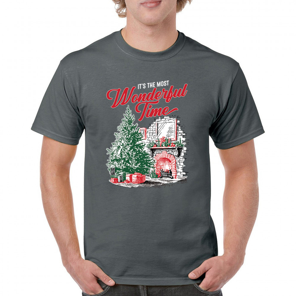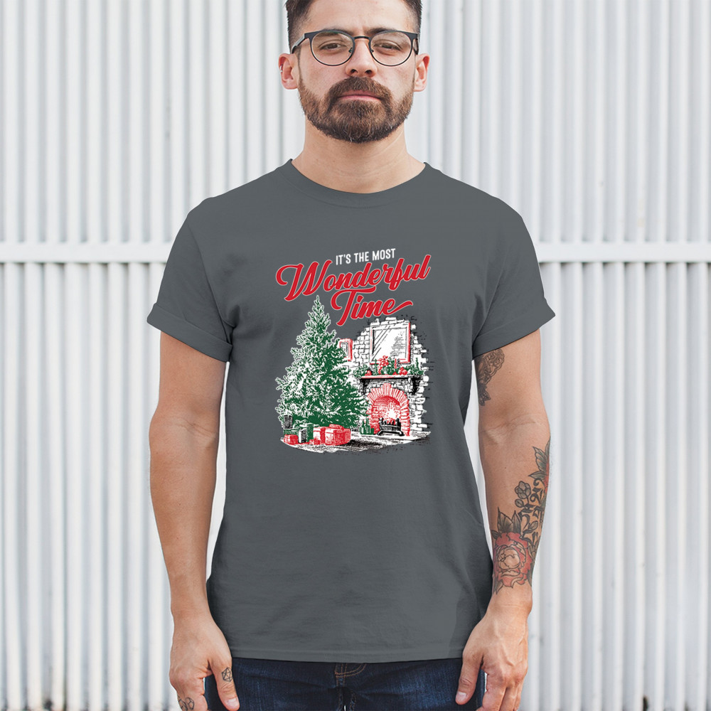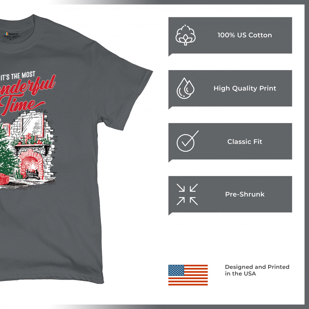 Make your holidays brighter with this “Most Wonderful Time†Christmas design, featuring a glowing fireplace, festive living room, and decorated Christmas tree. This cozy Christmas shirt combines holiday home decor style with classic Merry Xmas charm. Perfect for those who love Santa Claus, Rudolph, reindeer, Let It Snow vibes, and cheerful holiday fashion.