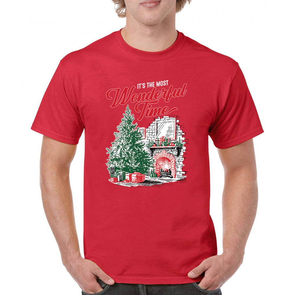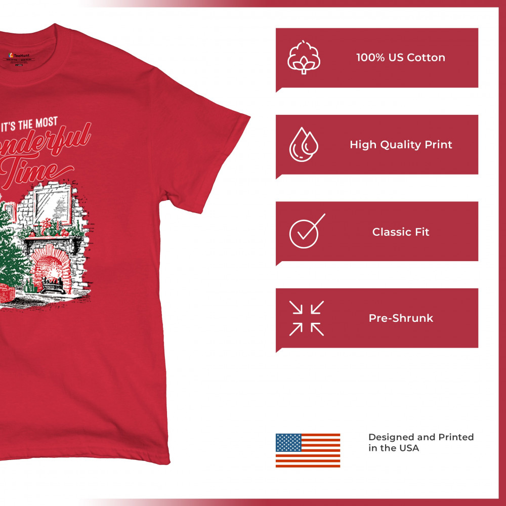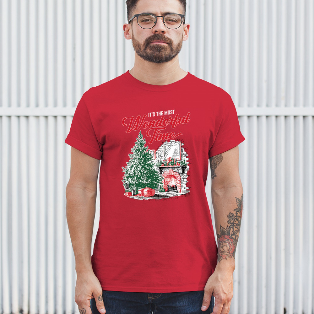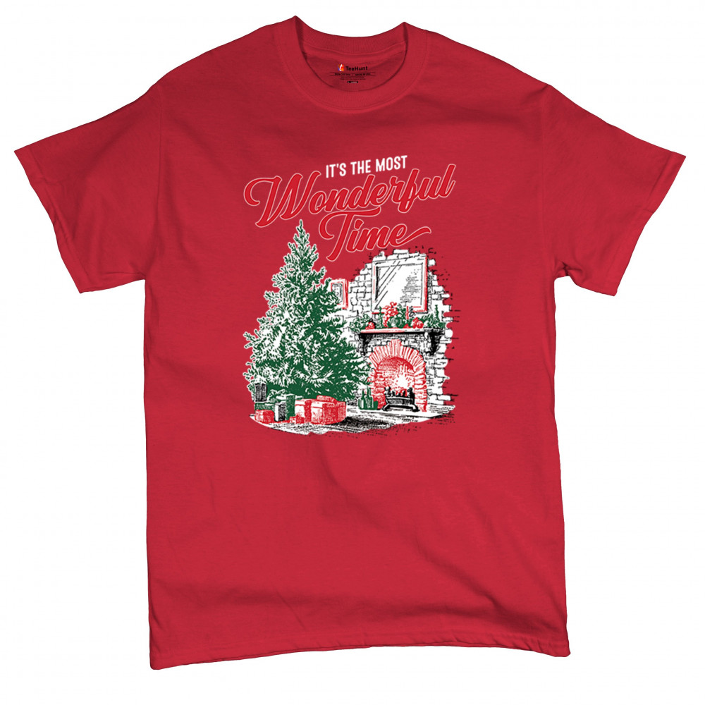 Make your holidays brighter with this “Most Wonderful Time†Christmas design, featuring a glowing fireplace, festive living room, and decorated Christmas tree. This cozy Christmas shirt combines holiday home decor style with classic Merry Xmas charm. Perfect for those who love Santa Claus, Rudolph, reindeer, Let It Snow vibes, and cheerful holiday fashion.