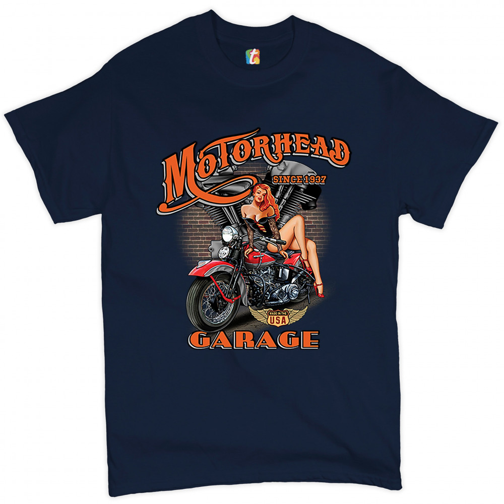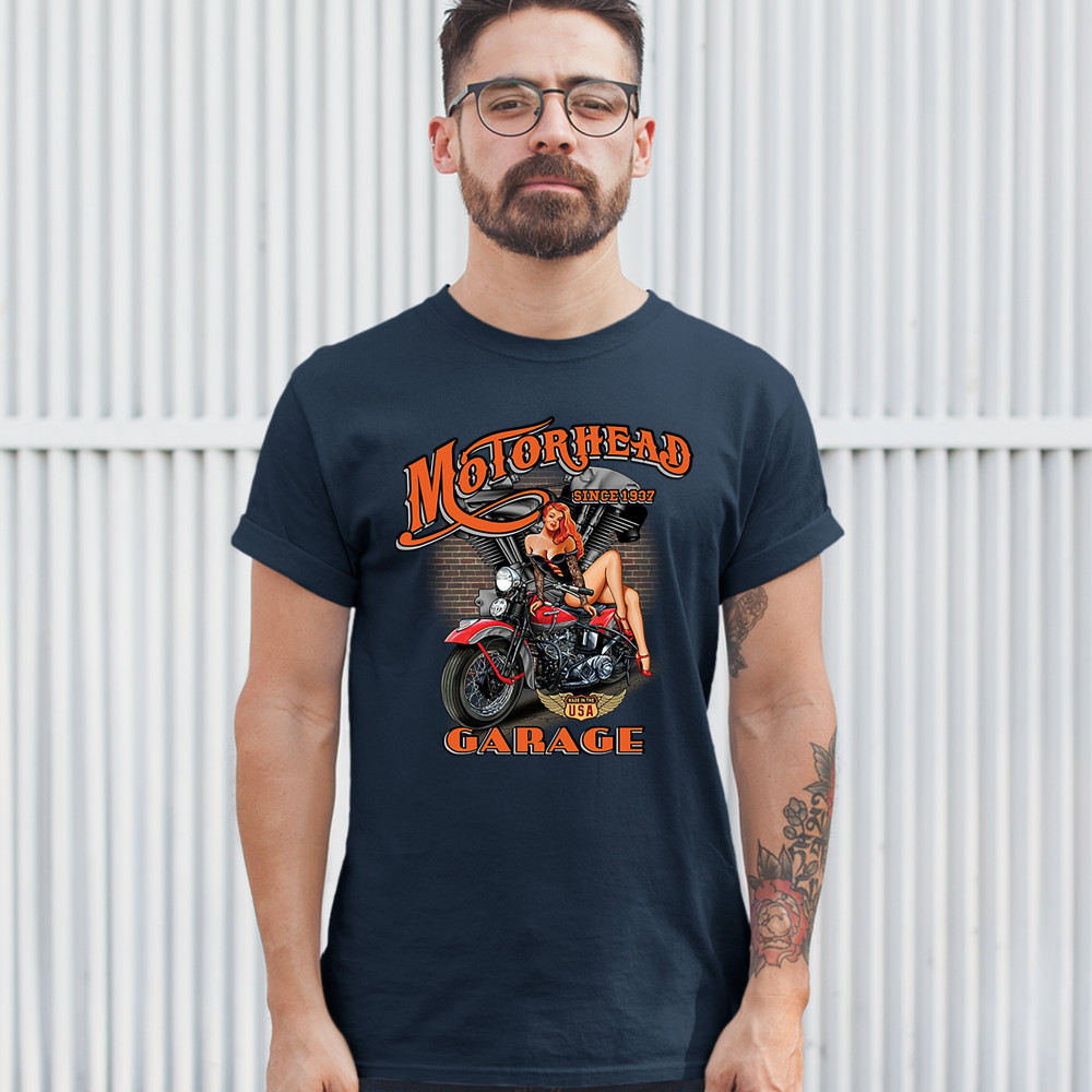 A print featuring a sexy pin-up girl sitting on a motorcycle. In the background there is a motorcycle engine and a brick wall. The print says: "Motorhead Garage since 1937" and features a "Made in the USA" sign. A great choice for a motorcycle enthusiast.