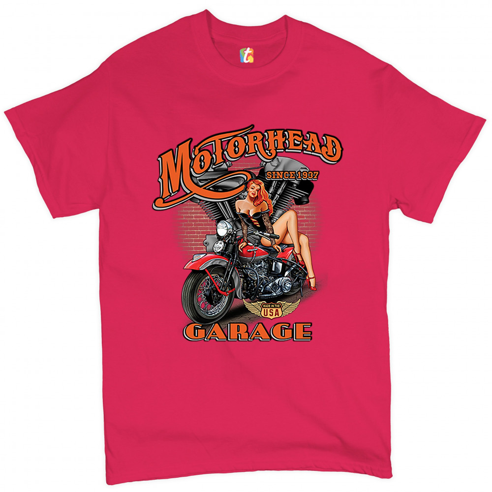 A print featuring a sexy pin-up girl sitting on a motorcycle. In the background there is a motorcycle engine and a brick wall. The print says: "Motorhead Garage since 1937" and features a "Made in the USA" sign. A great choice for a motorcycle enthusiast.
