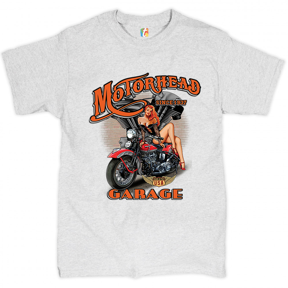 A print featuring a sexy pin-up girl sitting on a motorcycle. In the background there is a motorcycle engine and a brick wall. The print says: "Motorhead Garage since 1937" and features a "Made in the USA" sign. A great choice for a motorcycle enthusiast.