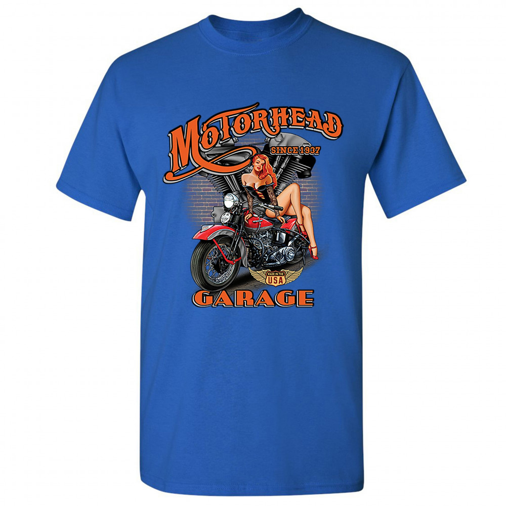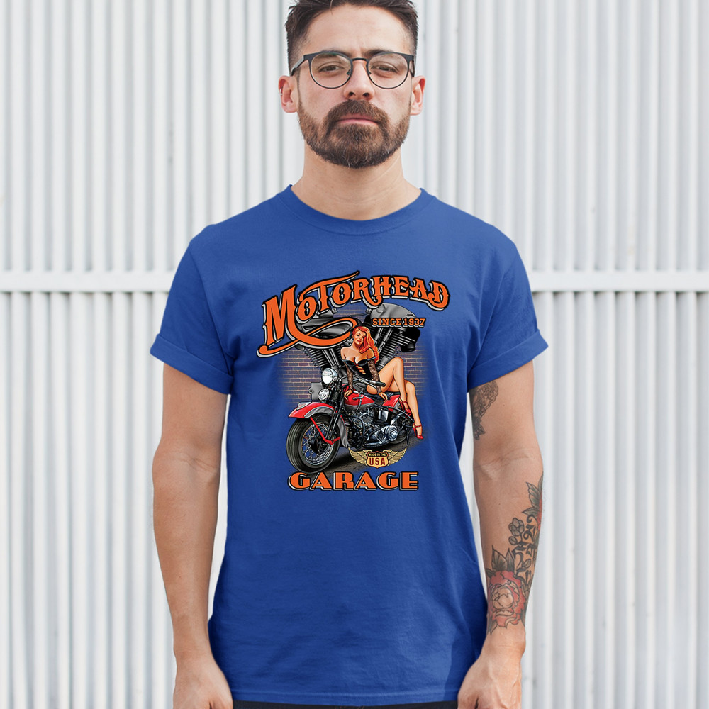 A print featuring a sexy pin-up girl sitting on a motorcycle. In the background there is a motorcycle engine and a brick wall. The print says: "Motorhead Garage since 1937" and features a "Made in the USA" sign. A great choice for a motorcycle enthusiast.