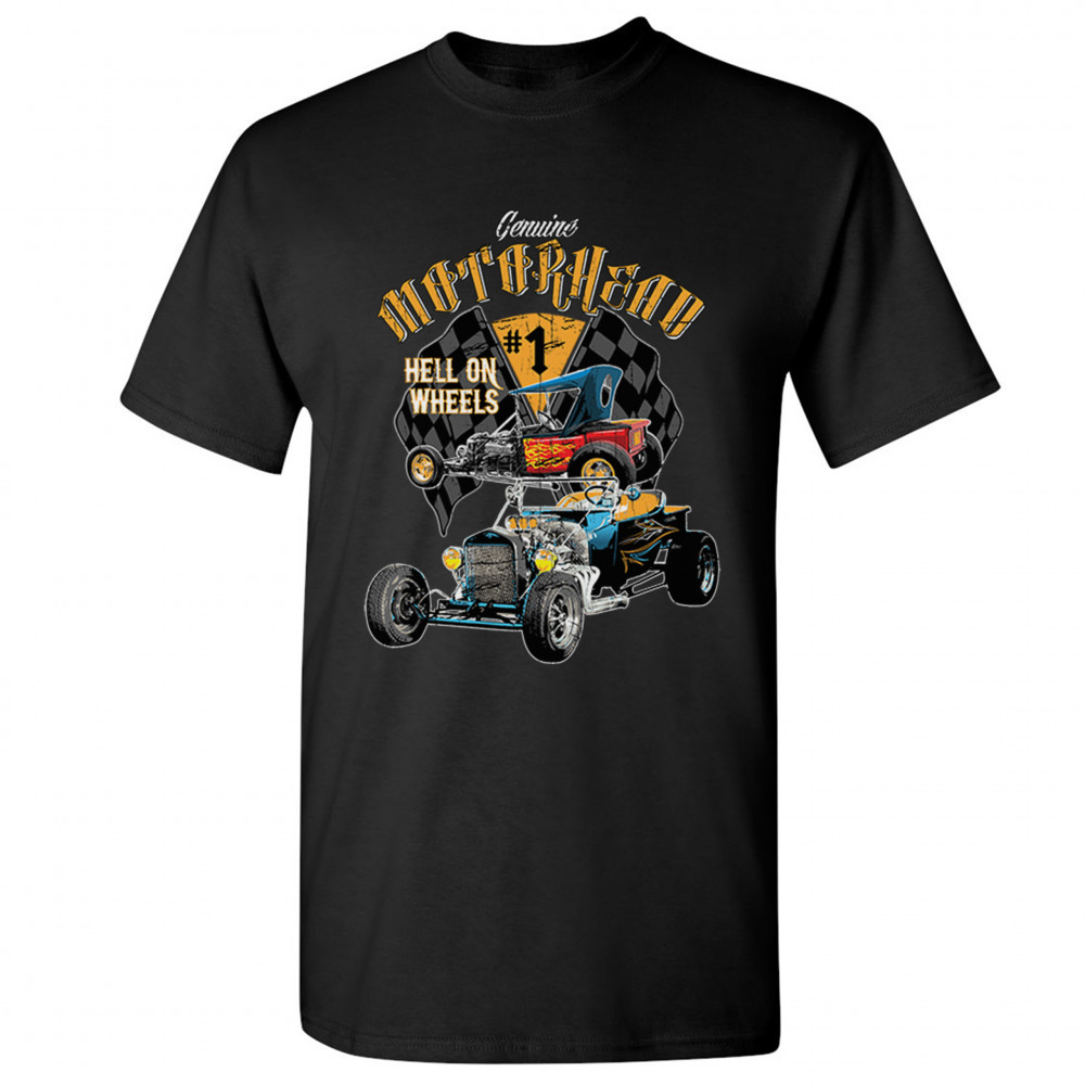 A print featuring two retro-looking hot rods. There are two racing flags in the background with "t-shirt1" written between them. The prints says: "genuine motorhead" and "hell on wheels". Great for Route 66 and hot rod fans.