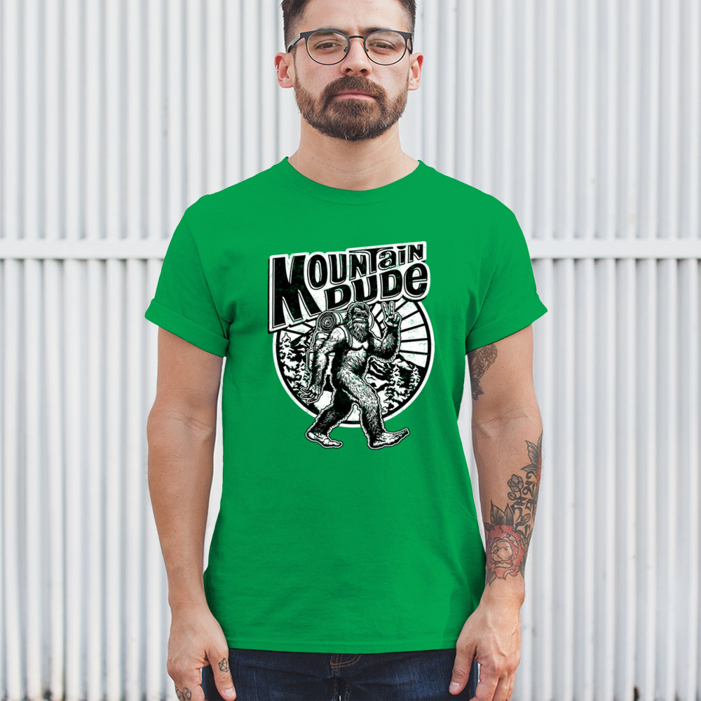 Celebrate outdoor adventures with the "Mountain Dude" design, featuring Sasquatch and mountain scenery. Perfect for hikers, campers, and Bigfoot fans.