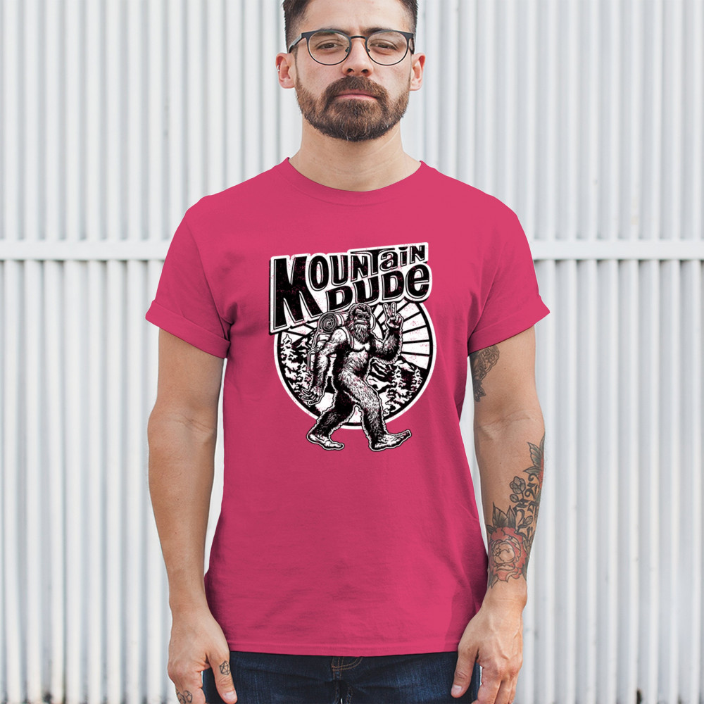 Celebrate outdoor adventures with the "Mountain Dude" design, featuring Sasquatch and mountain scenery. Perfect for hikers, campers, and Bigfoot fans.