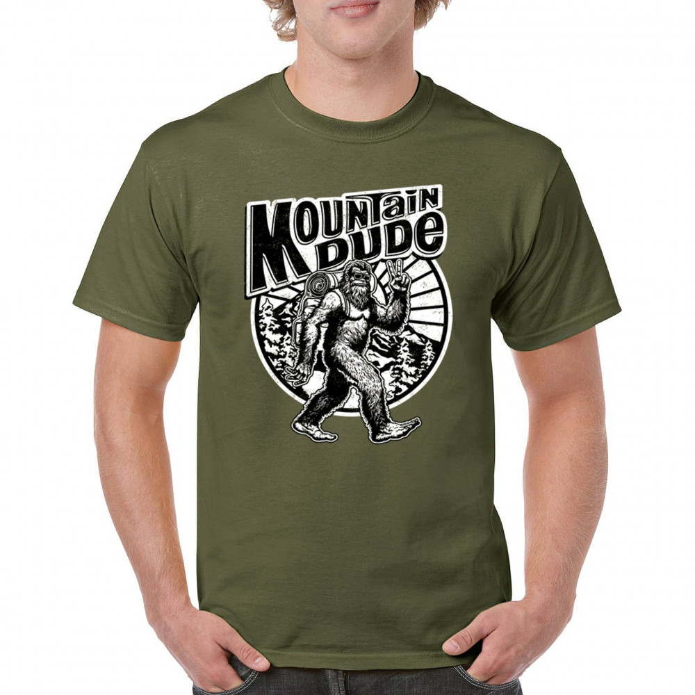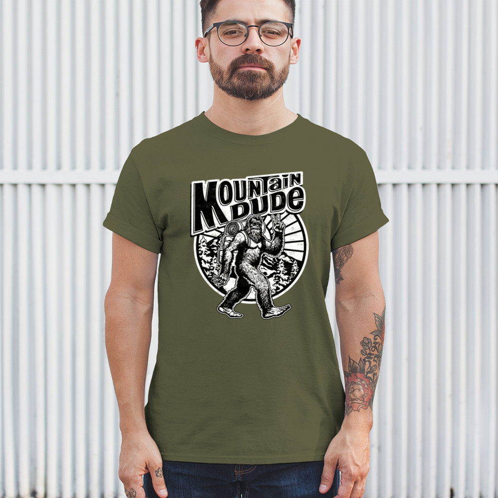 Celebrate outdoor adventures with the "Mountain Dude" design, featuring Sasquatch and mountain scenery. Perfect for hikers, campers, and Bigfoot fans.