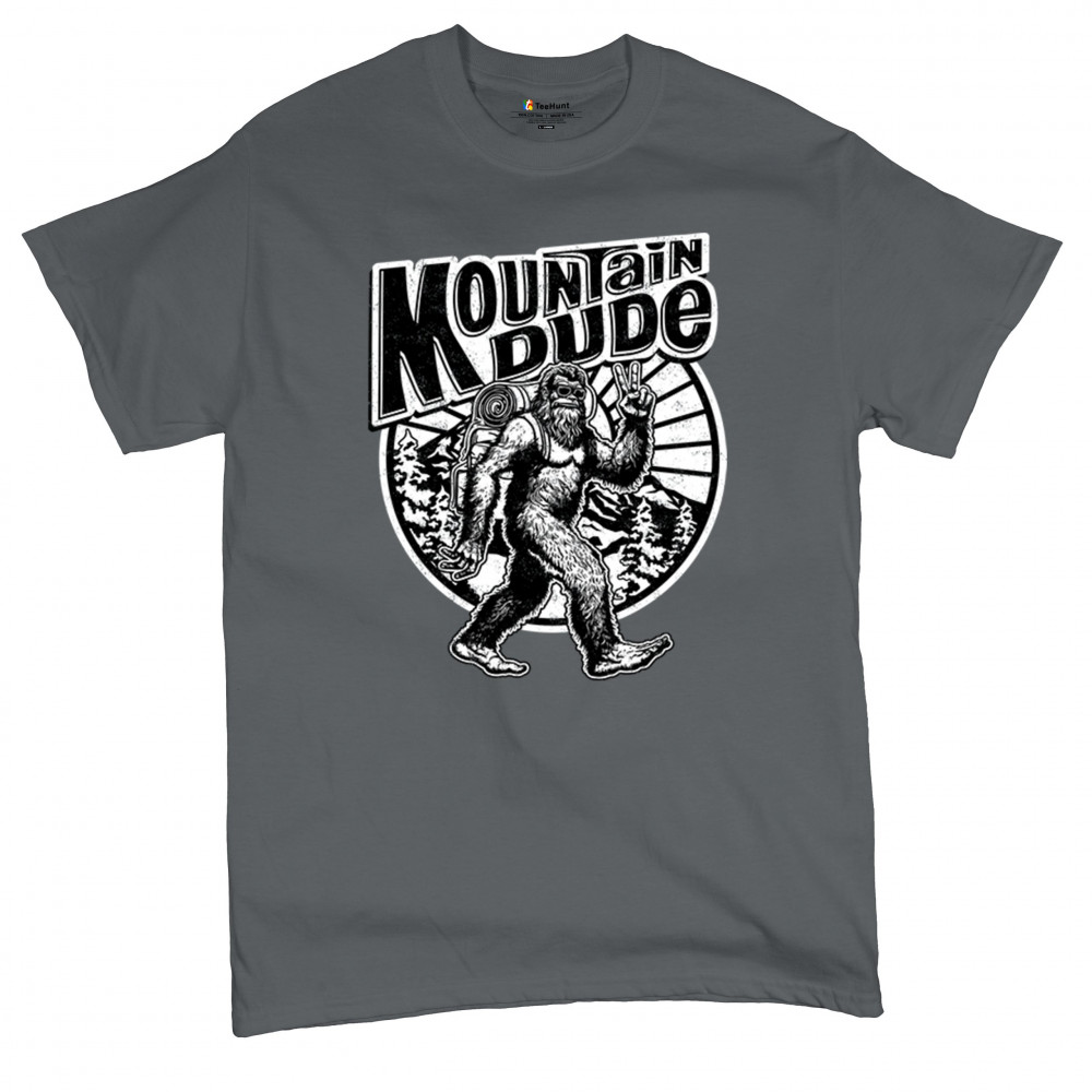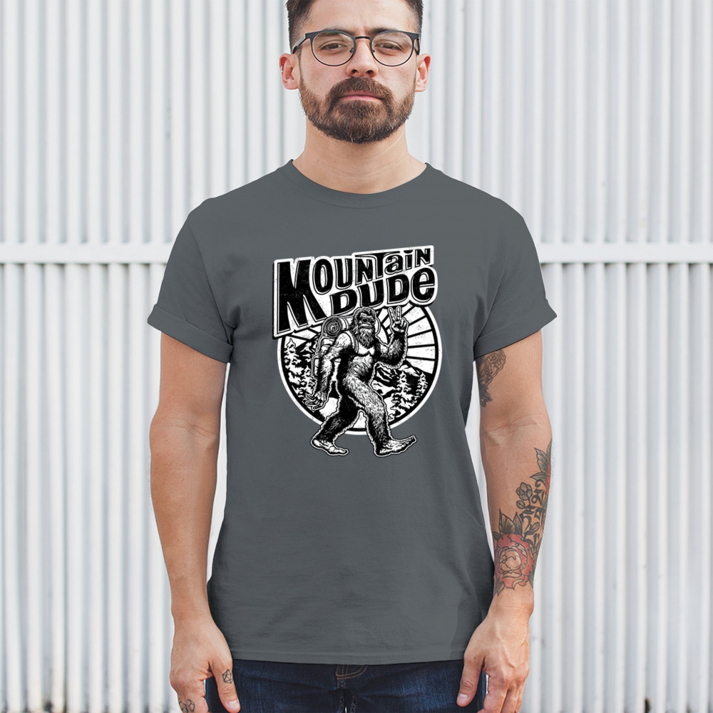 Celebrate outdoor adventures with the "Mountain Dude" design, featuring Sasquatch and mountain scenery. Perfect for hikers, campers, and Bigfoot fans.