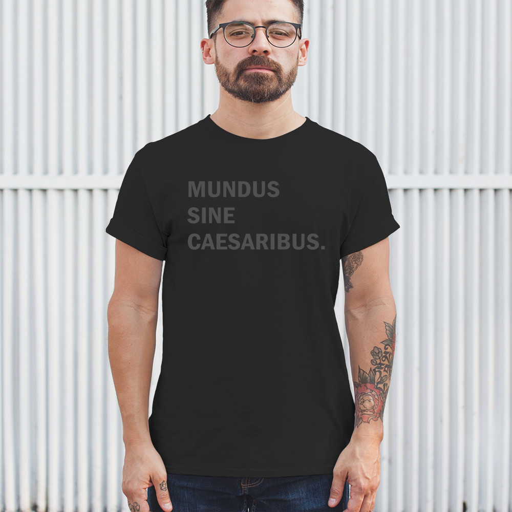 “Mundus Sine Caesaribus†Latin parody tee for rebels, meme lovers, and those tired of tech overlords. Make a witty anti-authority statement.