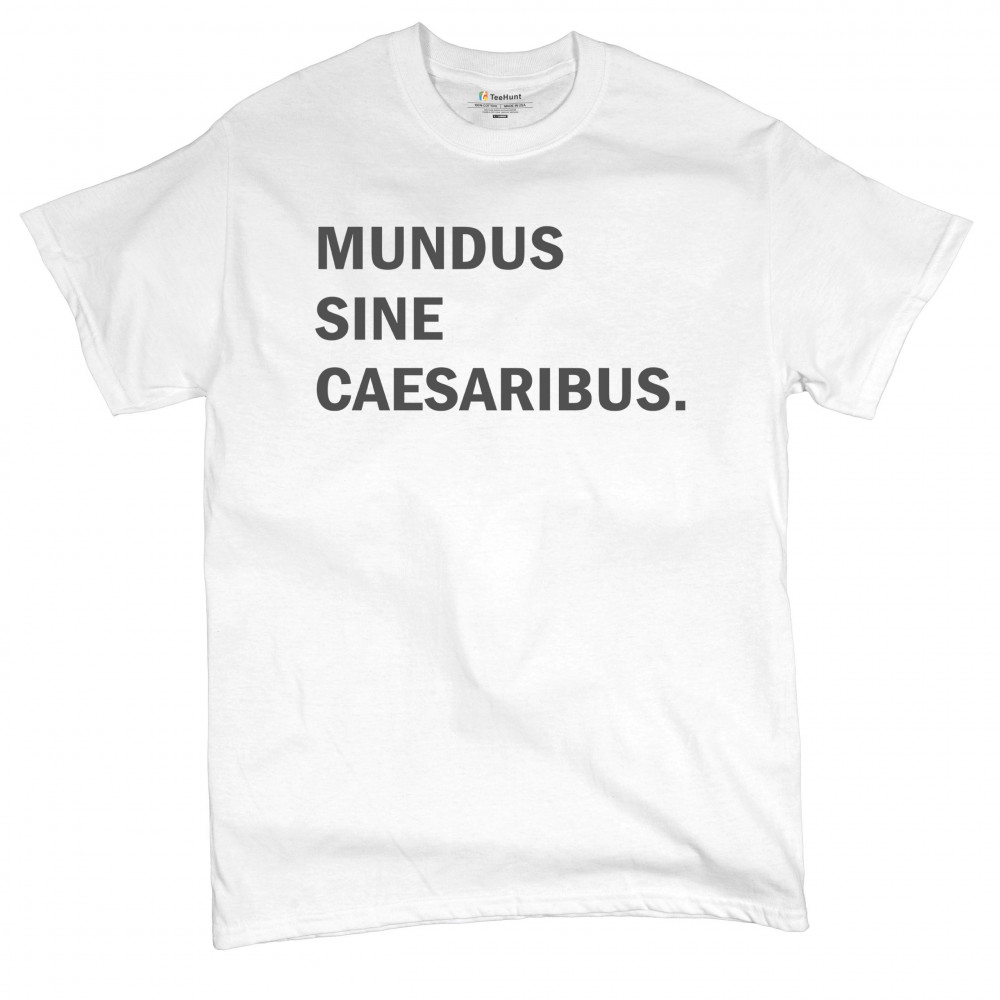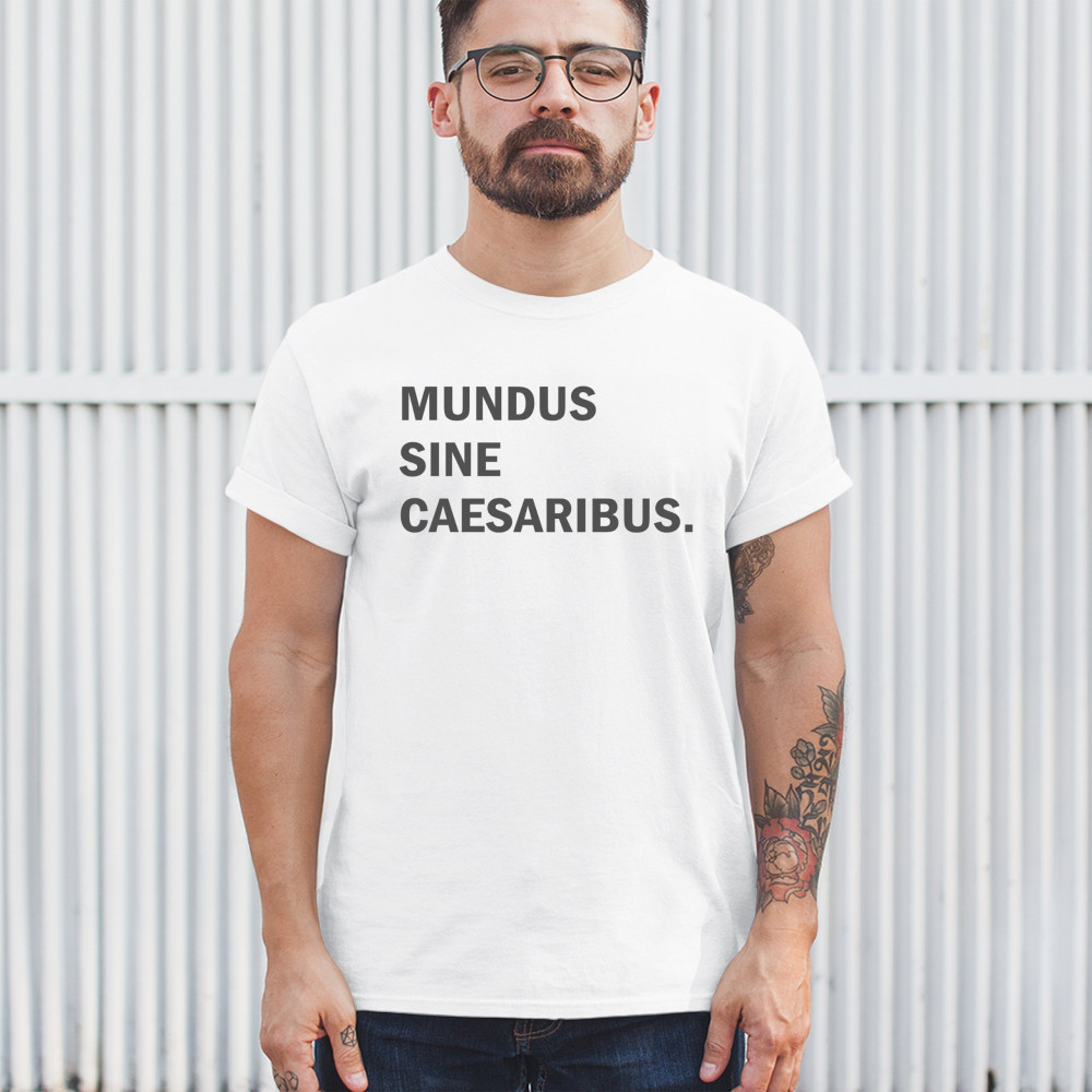 “Mundus Sine Caesaribus†Latin parody tee for rebels, meme lovers, and those tired of tech overlords. Make a witty anti-authority statement.