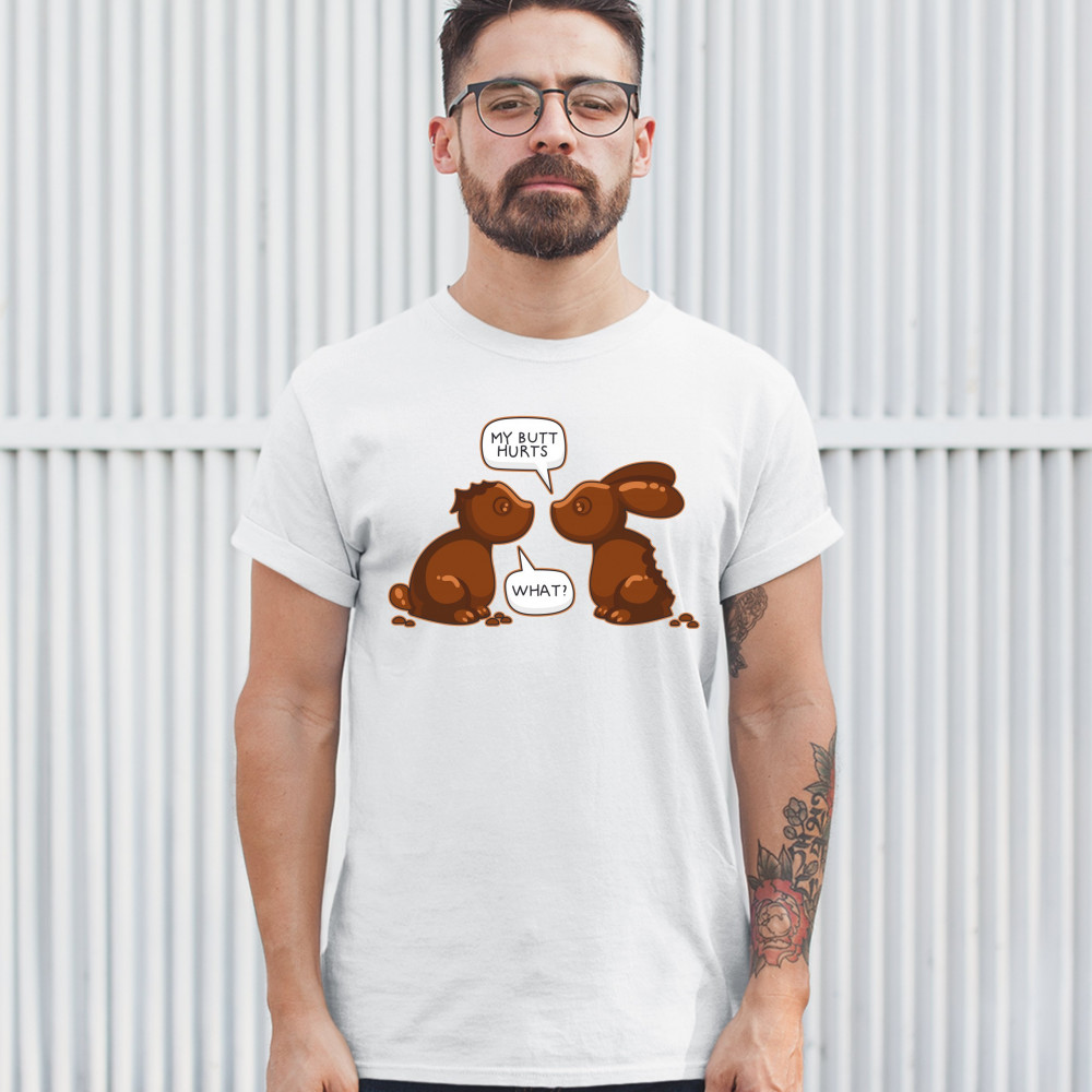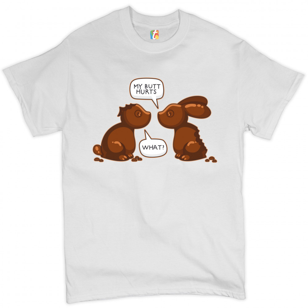 MY BUTT HURTS - WHAT? t-shirt chocolate bunnies easter rabbits men's tee white