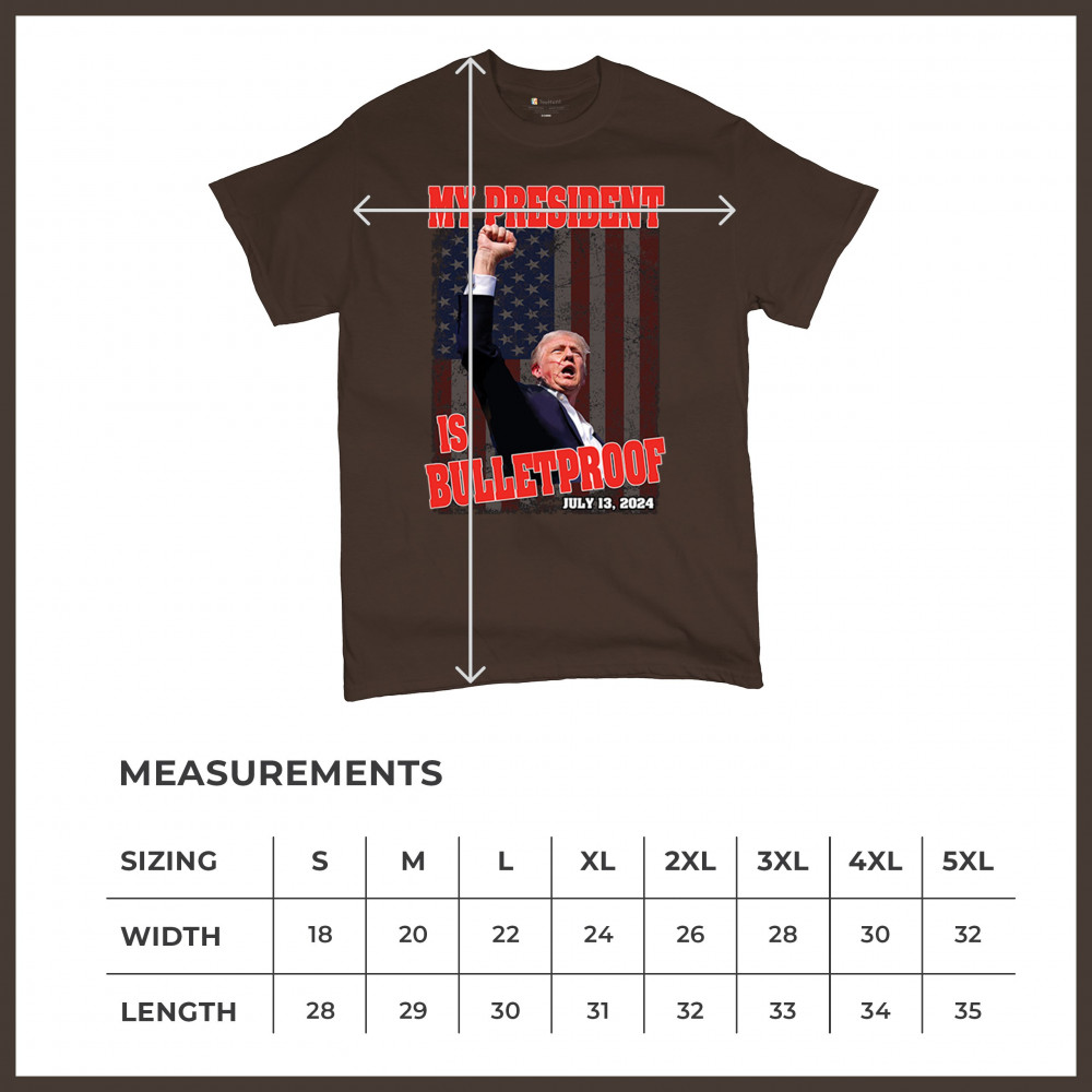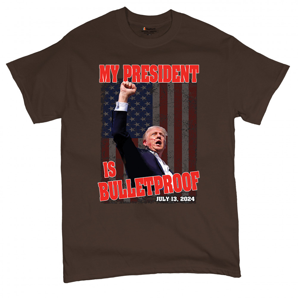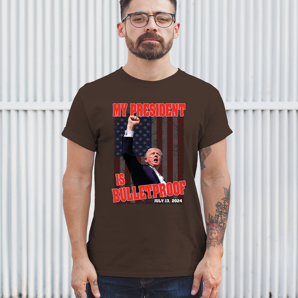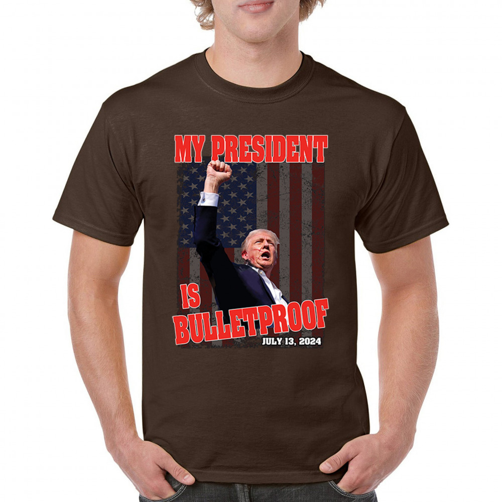 Support Trump with our "My President is Bulletproof" design, perfect for rallies and everyday wear. Show your patriotic pride and conservative values.