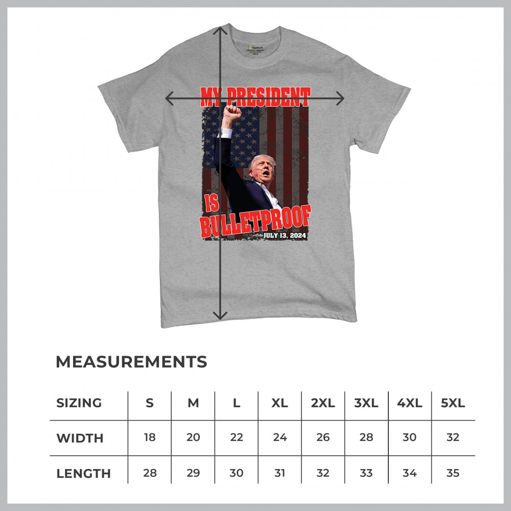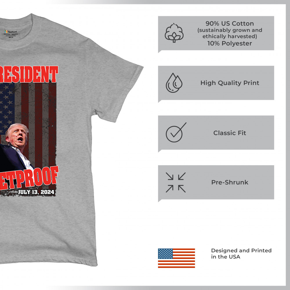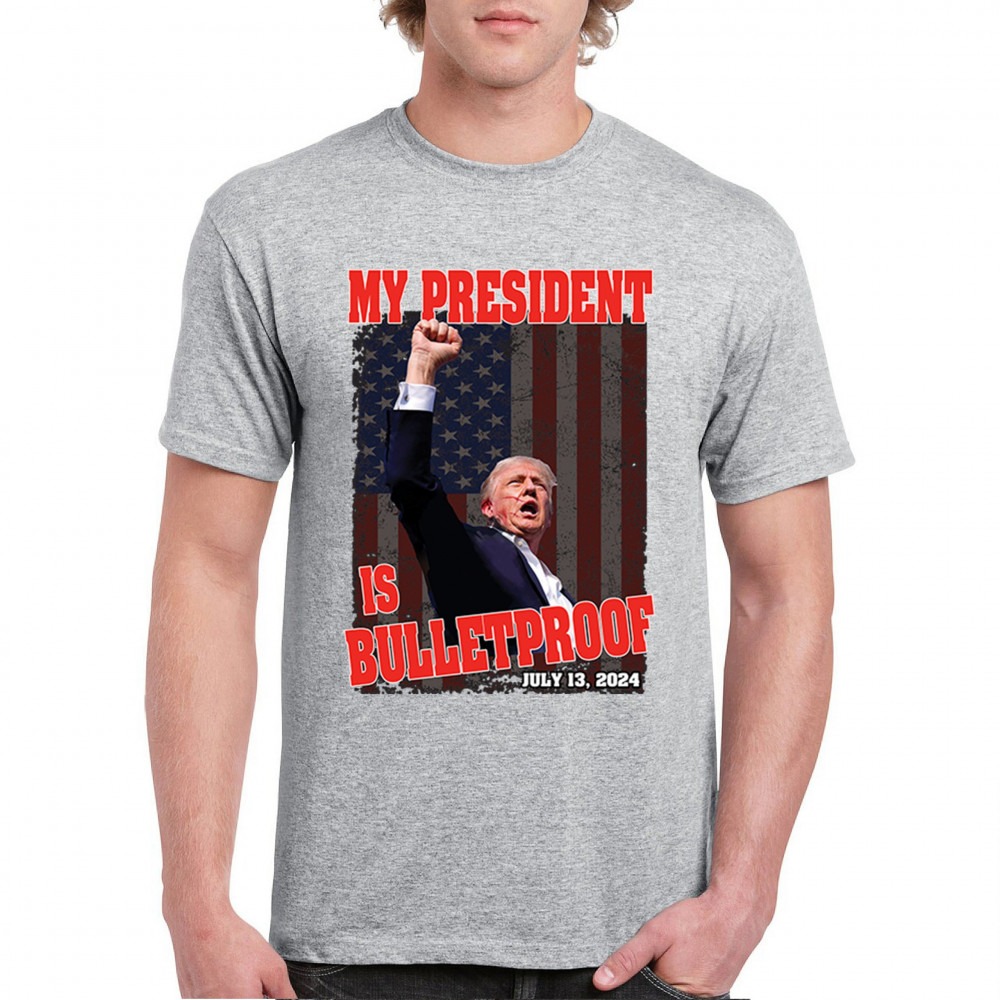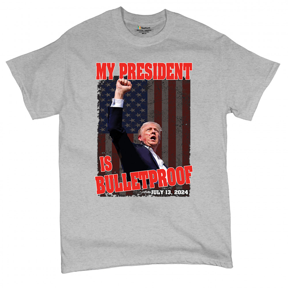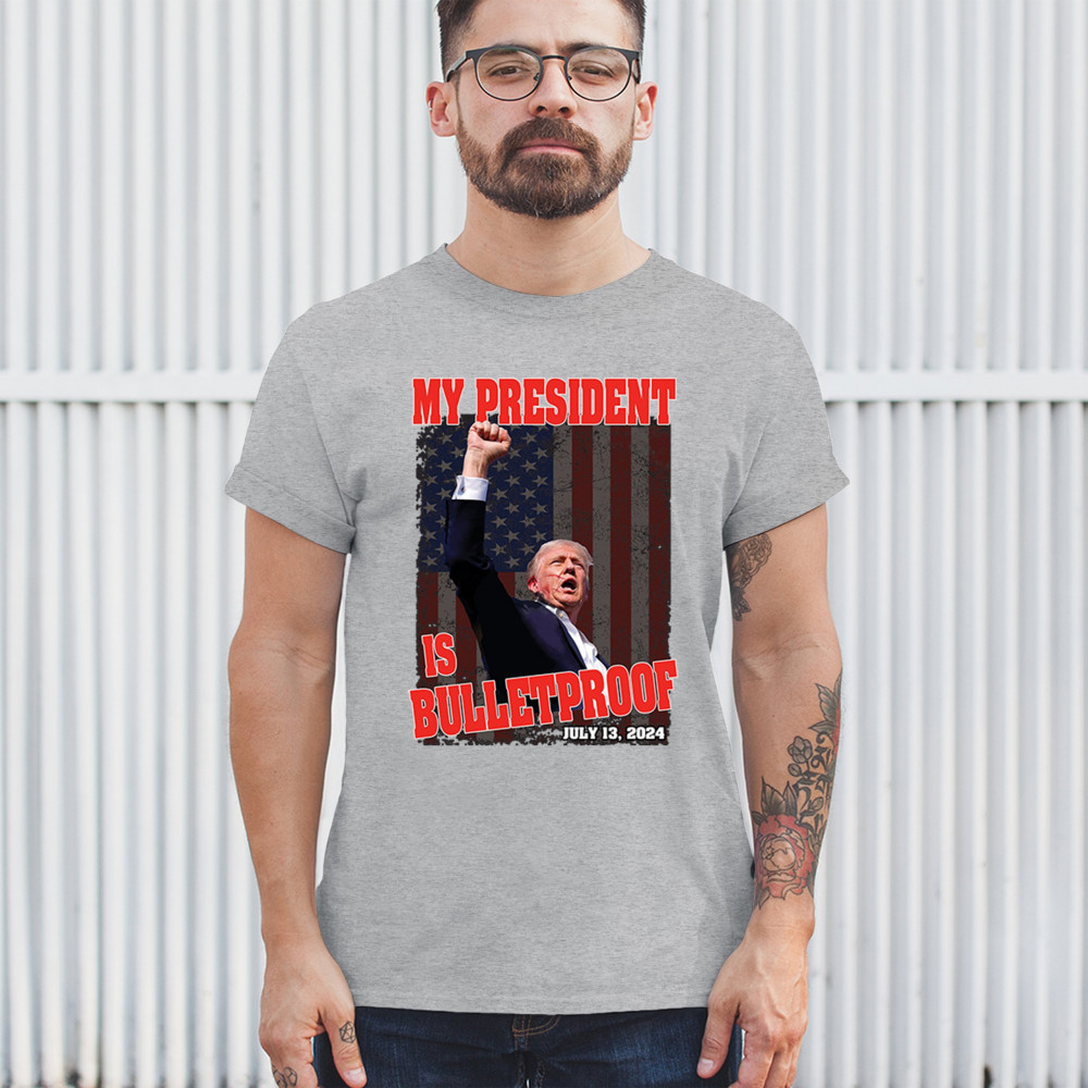 Support Trump with our "My President is Bulletproof" design, perfect for rallies and everyday wear. Show your patriotic pride and conservative values.