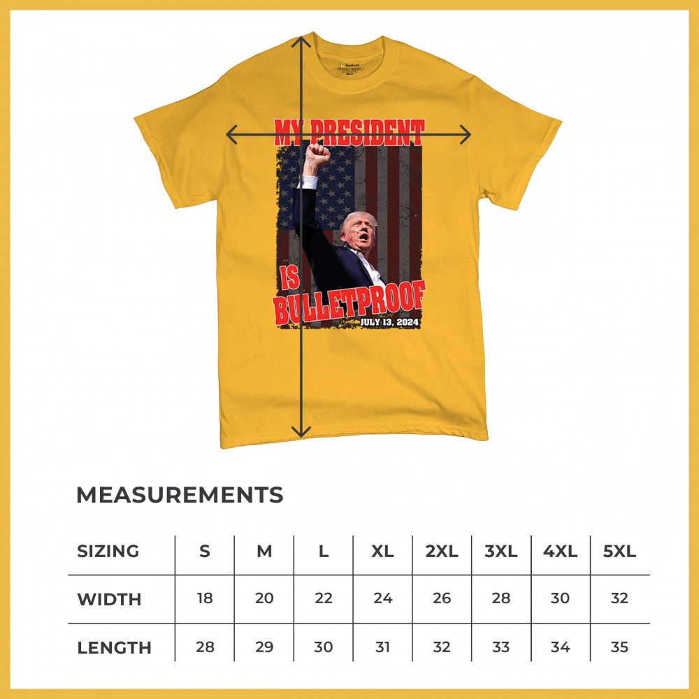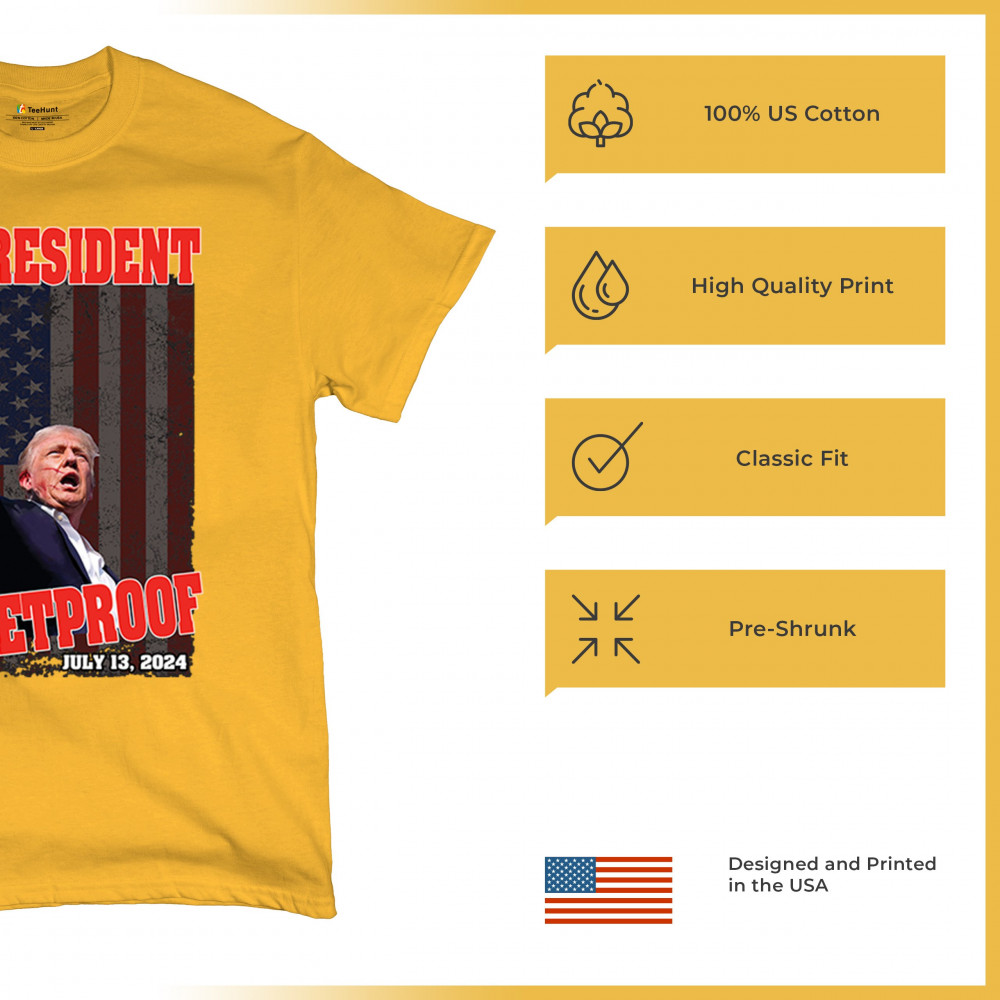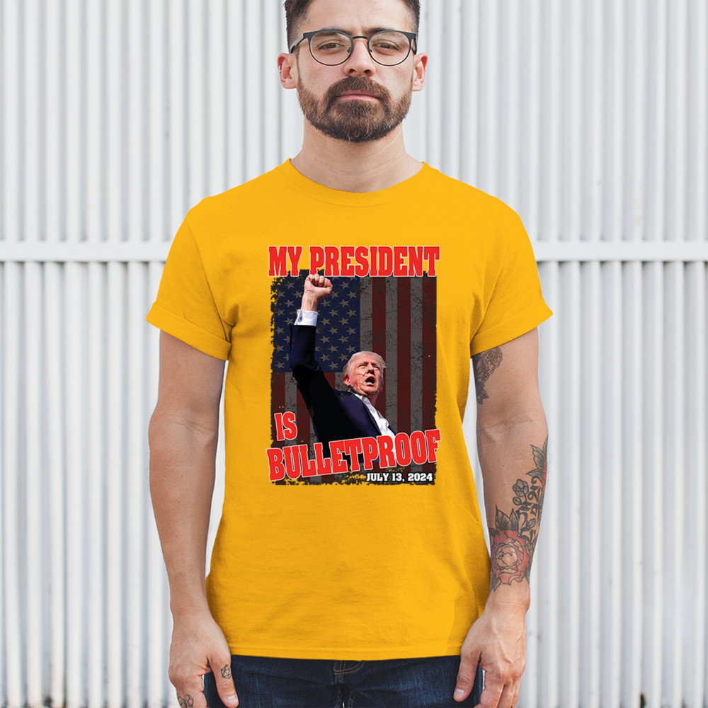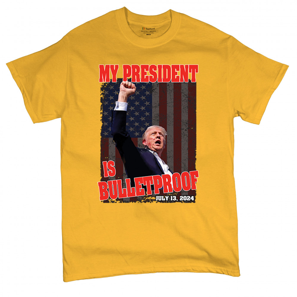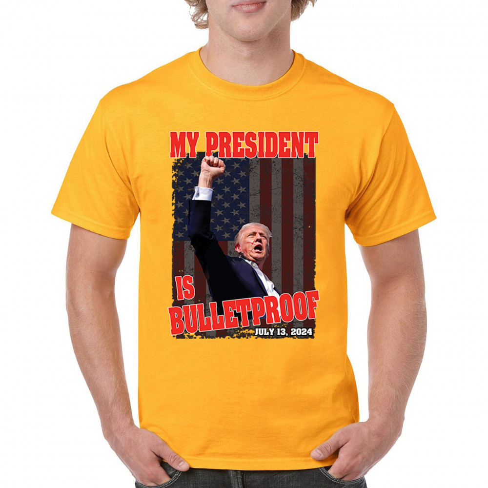 Support Trump with our "My President is Bulletproof" design, perfect for rallies and everyday wear. Show your patriotic pride and conservative values.