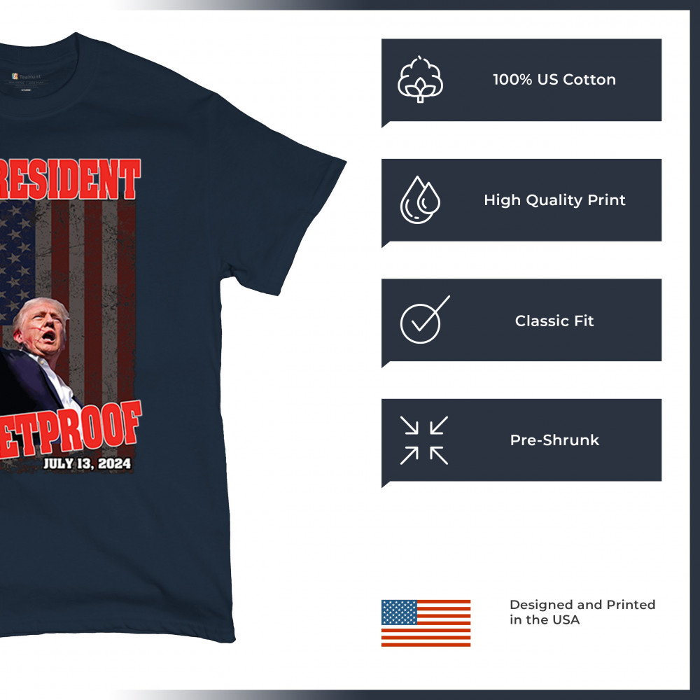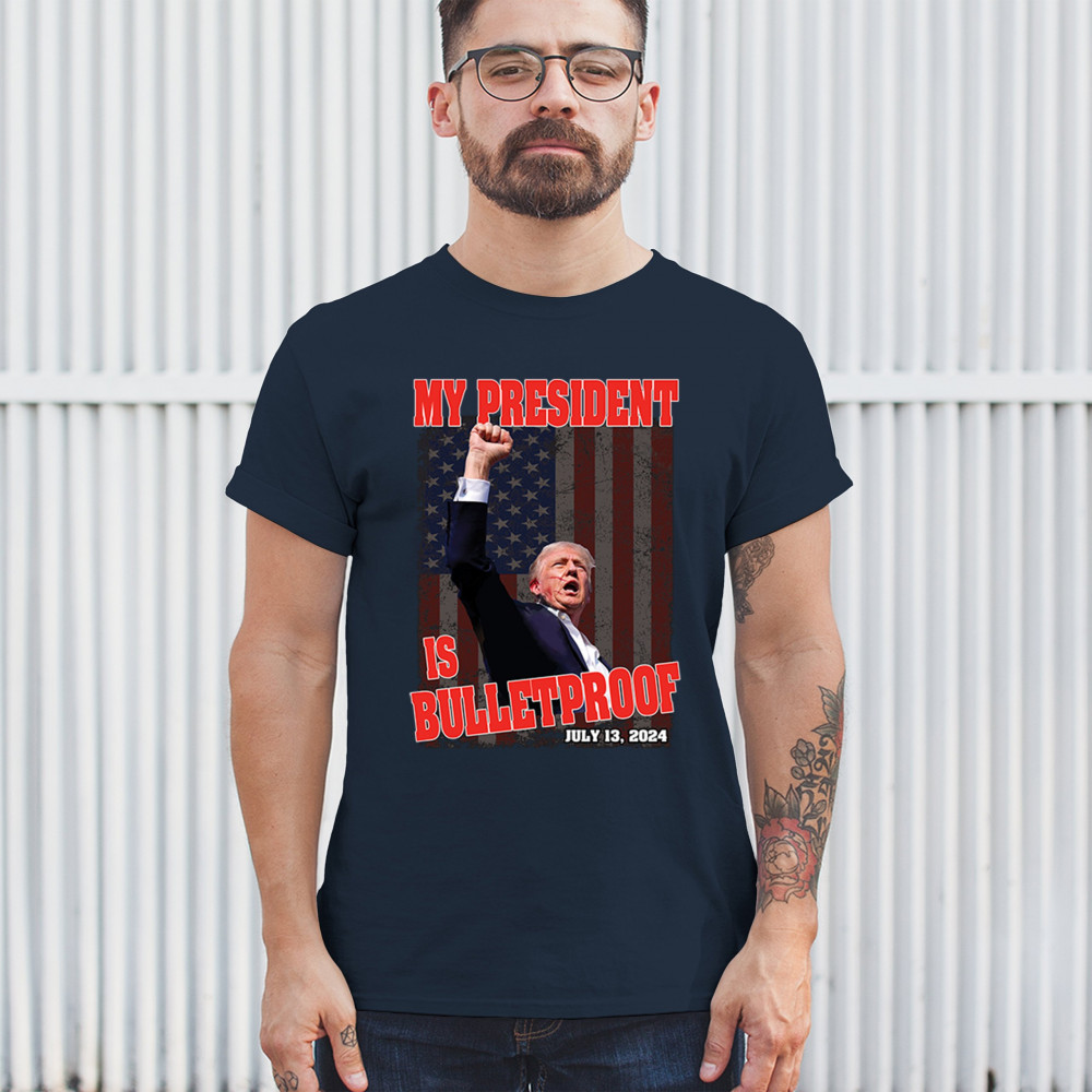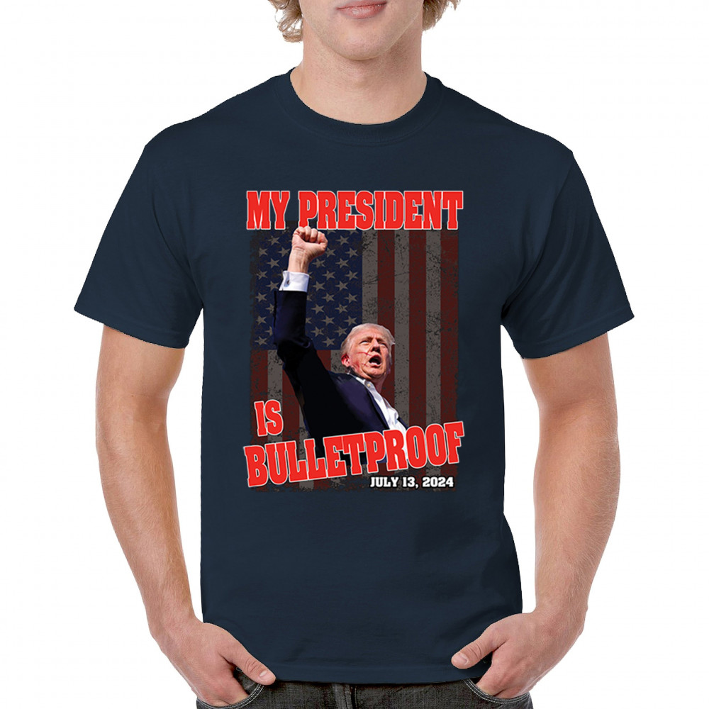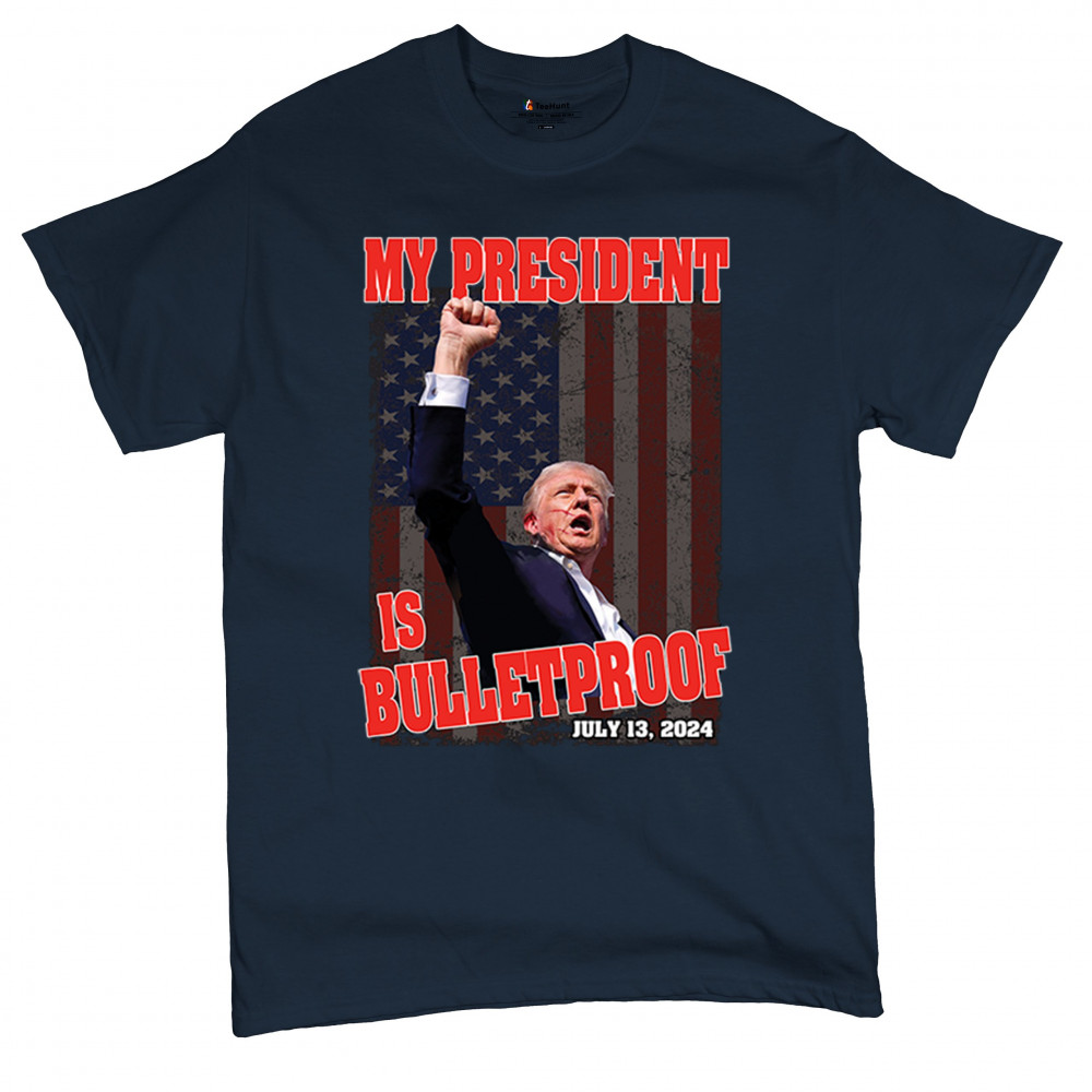 Support Trump with our "My President is Bulletproof" design, perfect for rallies and everyday wear. Show your patriotic pride and conservative values.