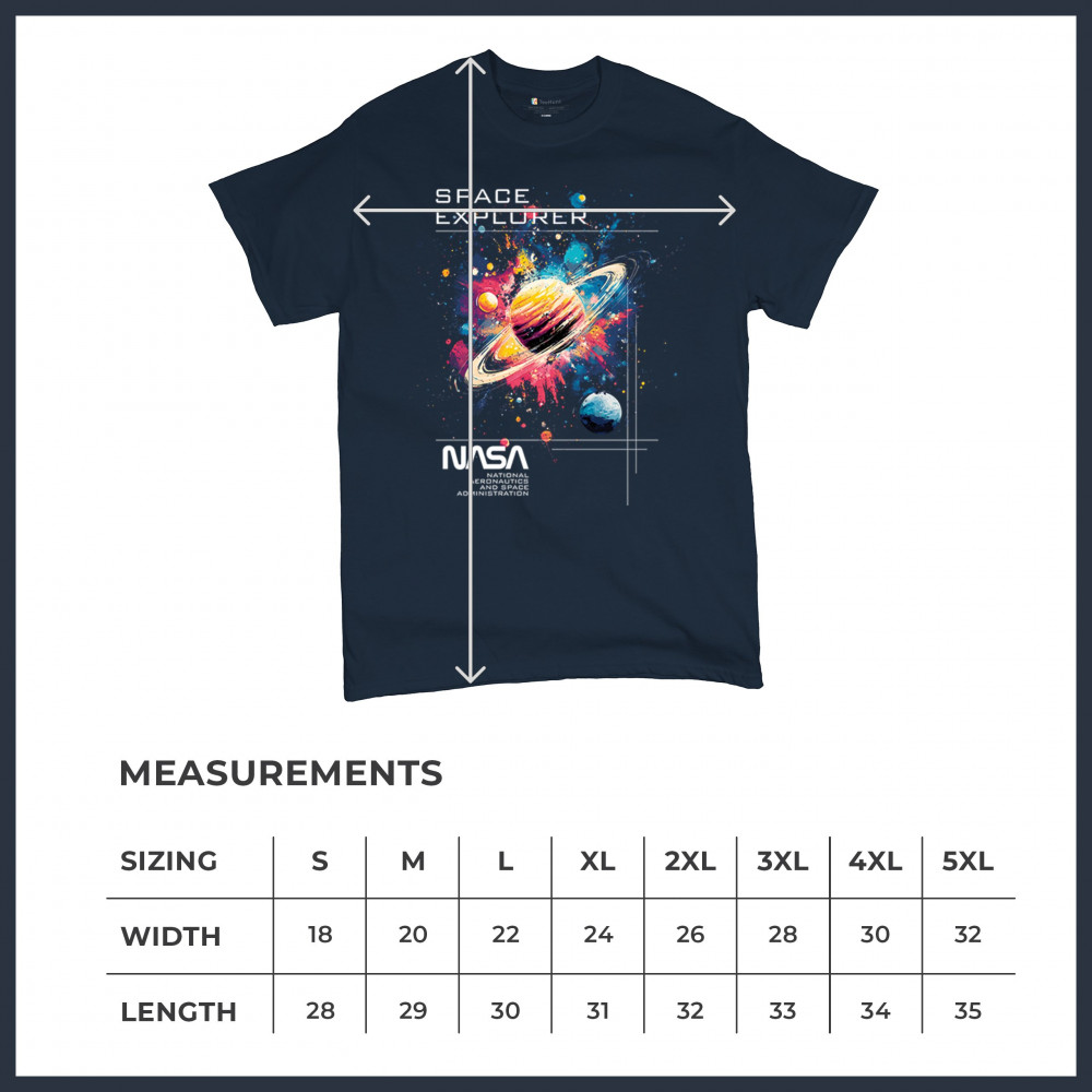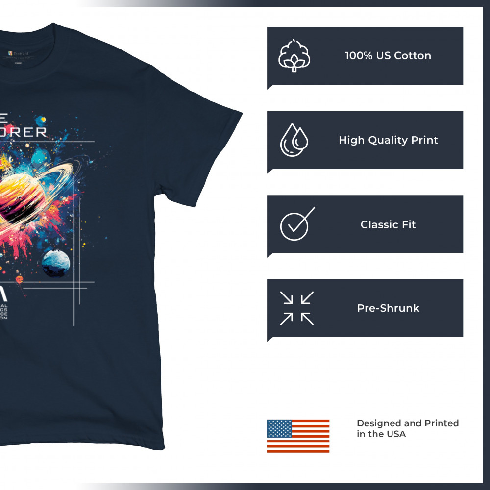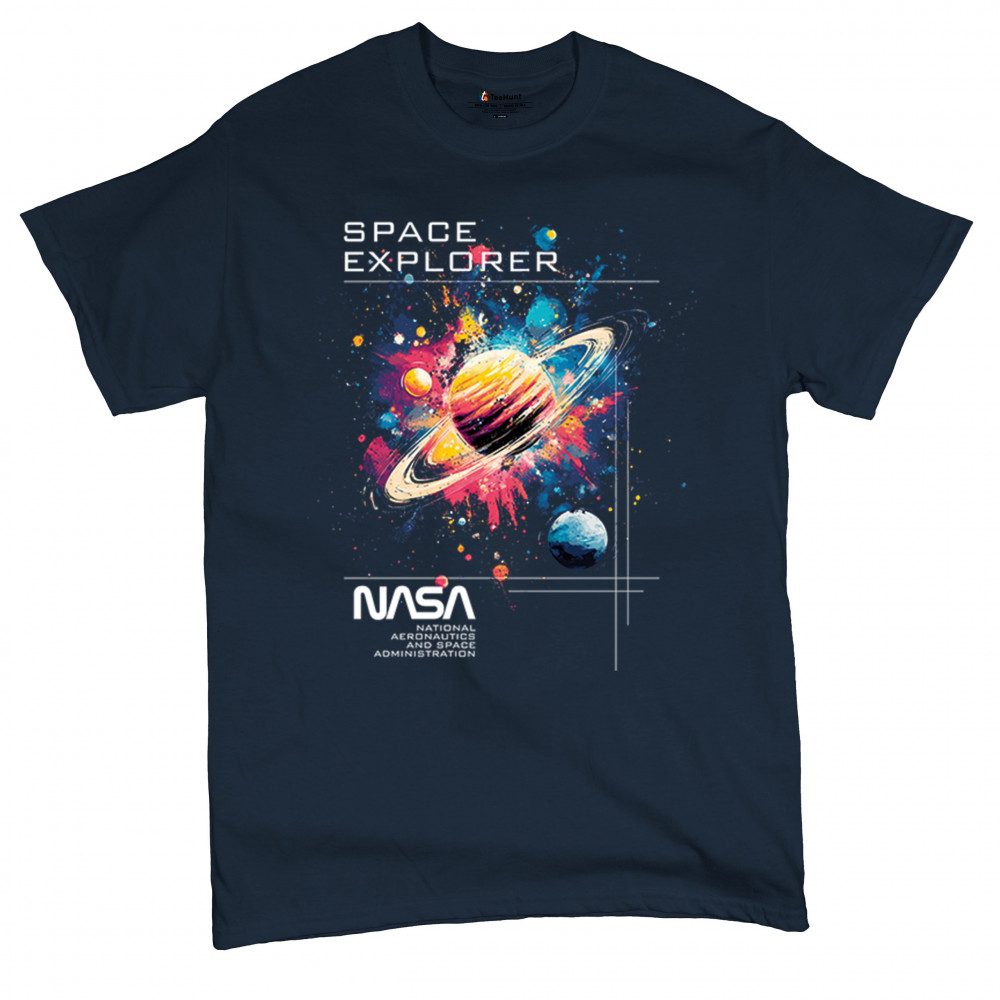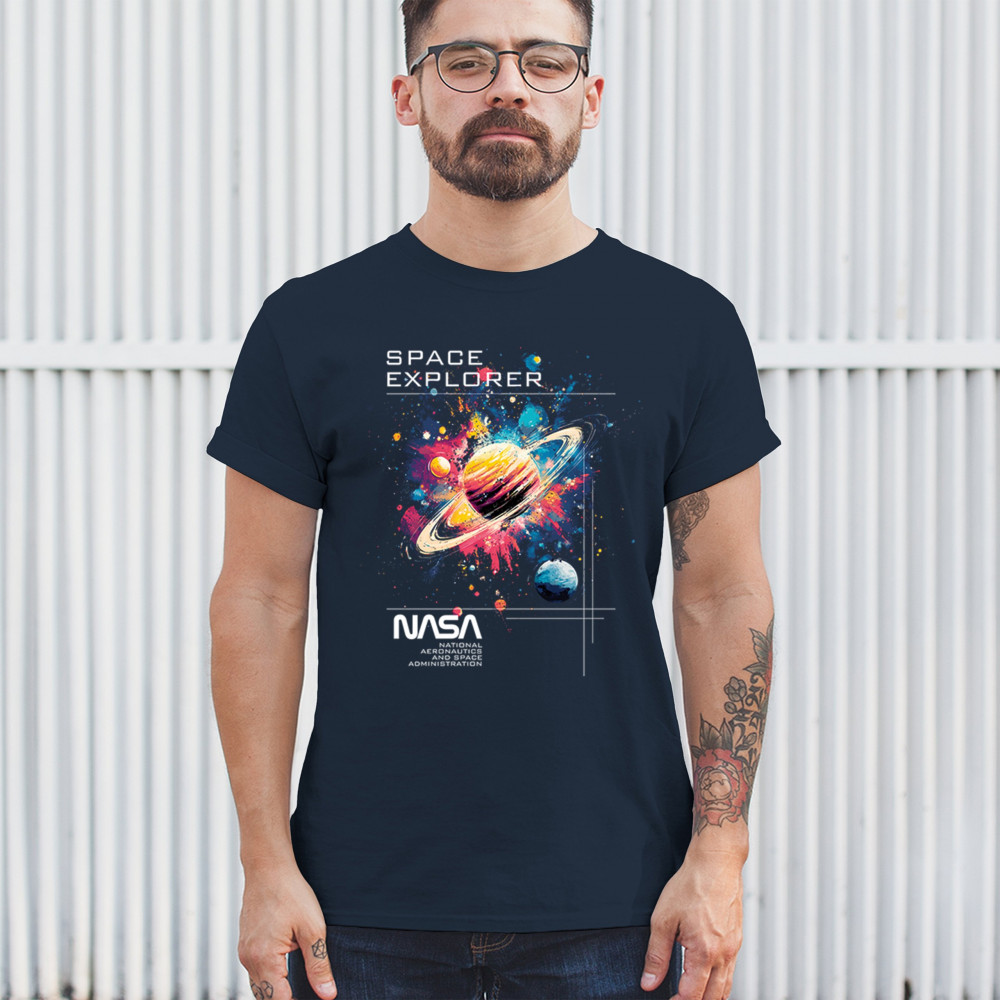 Bold and inspiring, this NASA Space Explorer design features Saturn in a cosmic paint splash with official branding. Ideal for fans of the Apollo program, moon landings, rocket launch history, and vintage NASA aesthetics. A great fit for space travel lovers, cosmic dreamers, and proud supporters of American exploration.