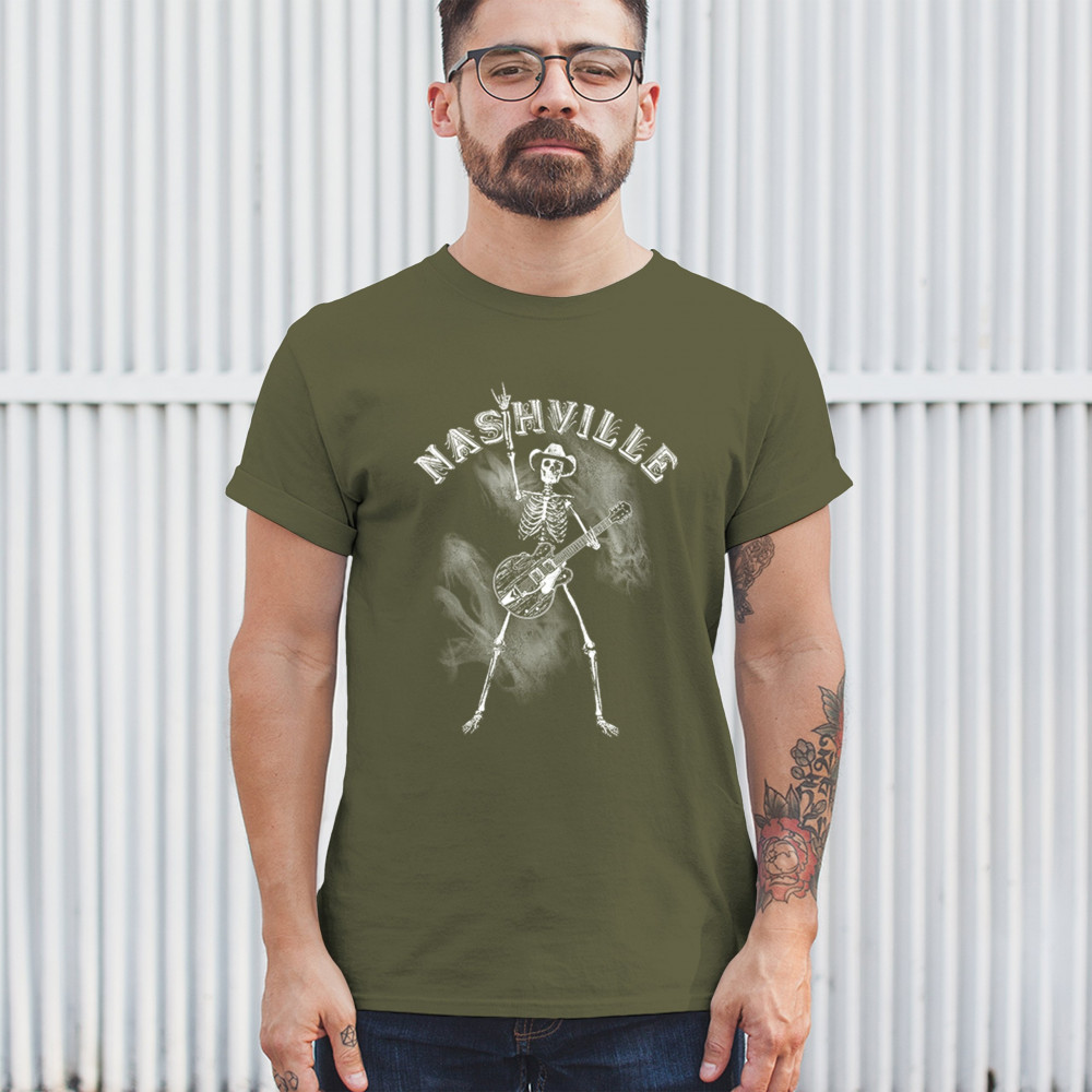 Bold skeleton cowboy design with Nashville grit and country rock vibes. Perfect for fans of music, guitars, and rebel southern style.