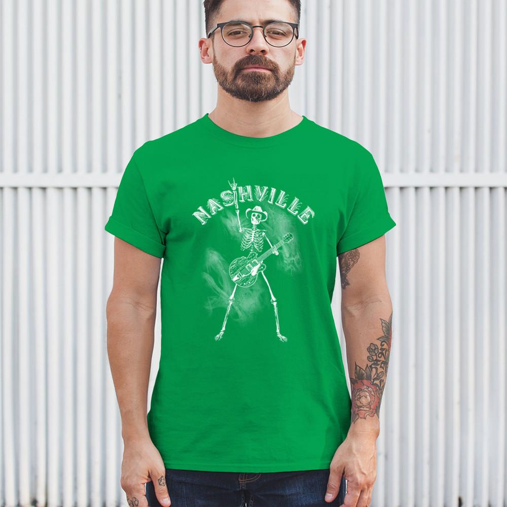 Bold skeleton cowboy design with Nashville grit and country rock vibes. Perfect for fans of music, guitars, and rebel southern style.