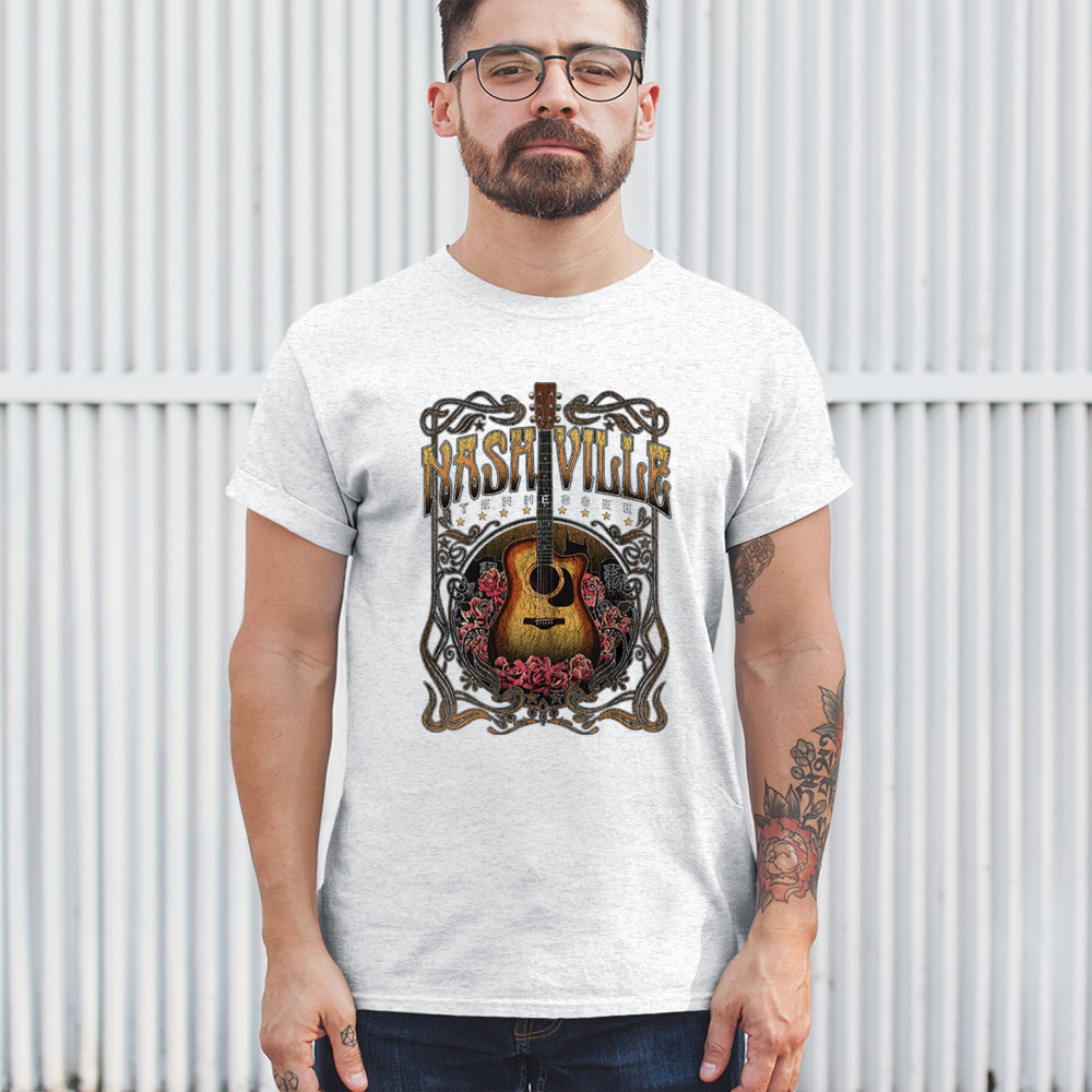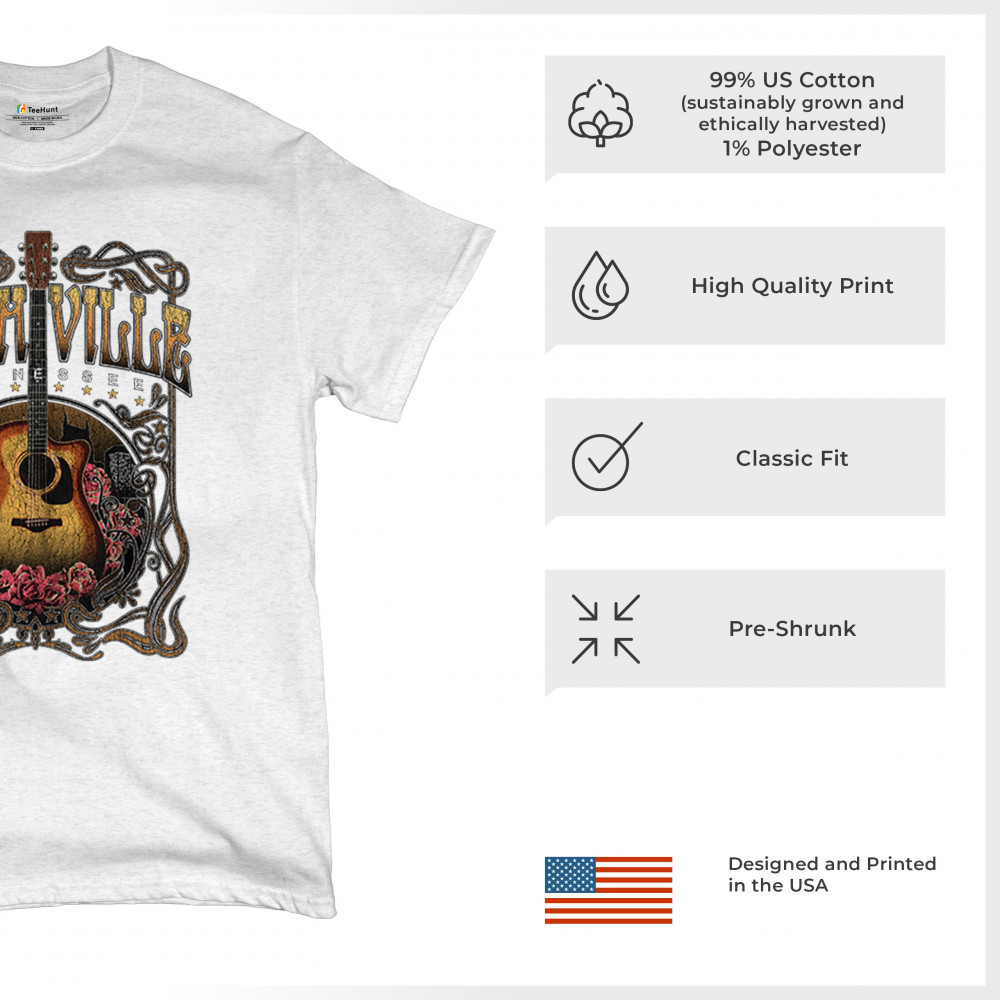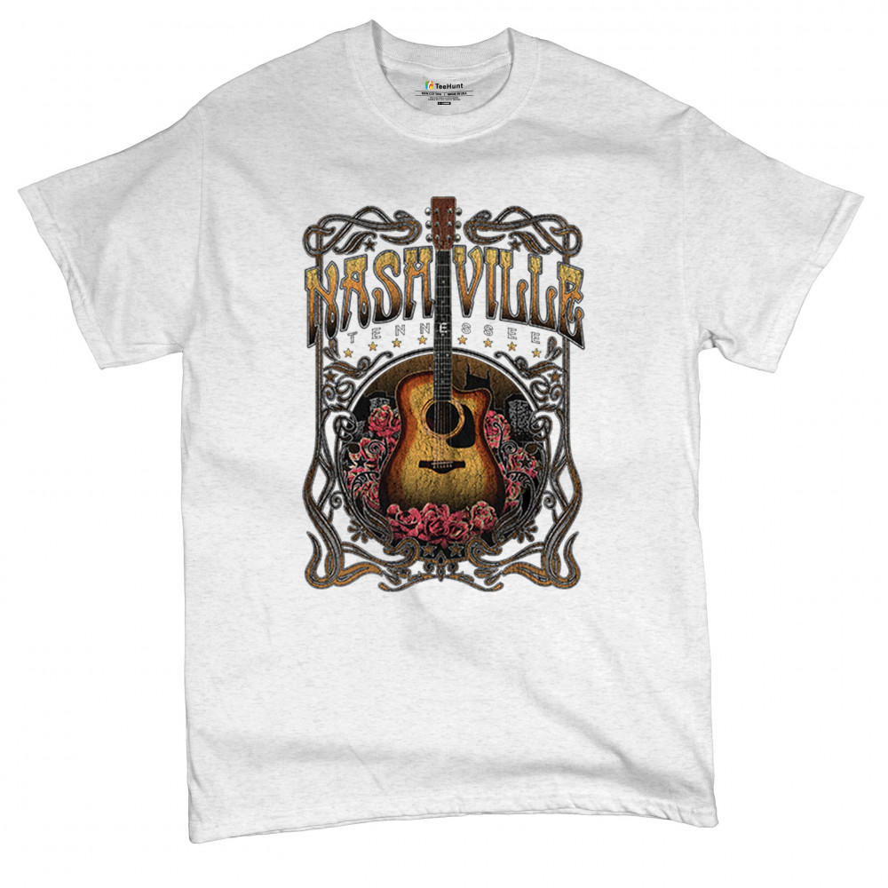 Vintage Nashville Tennessee design with rustic guitar and roses. Great for concerts, country music fans, road trips, and souvenir wear.