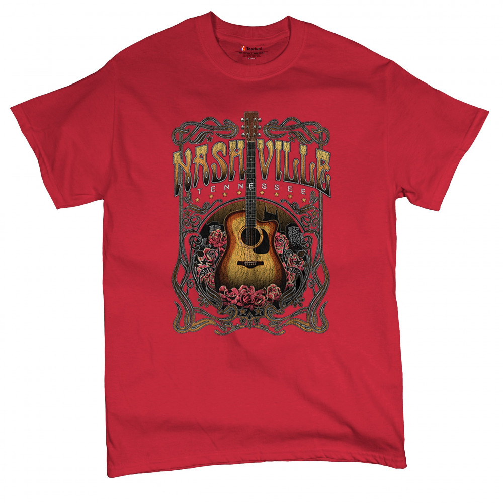 Vintage Nashville Tennessee design with rustic guitar and roses. Great for concerts, country music fans, road trips, and souvenir wear.