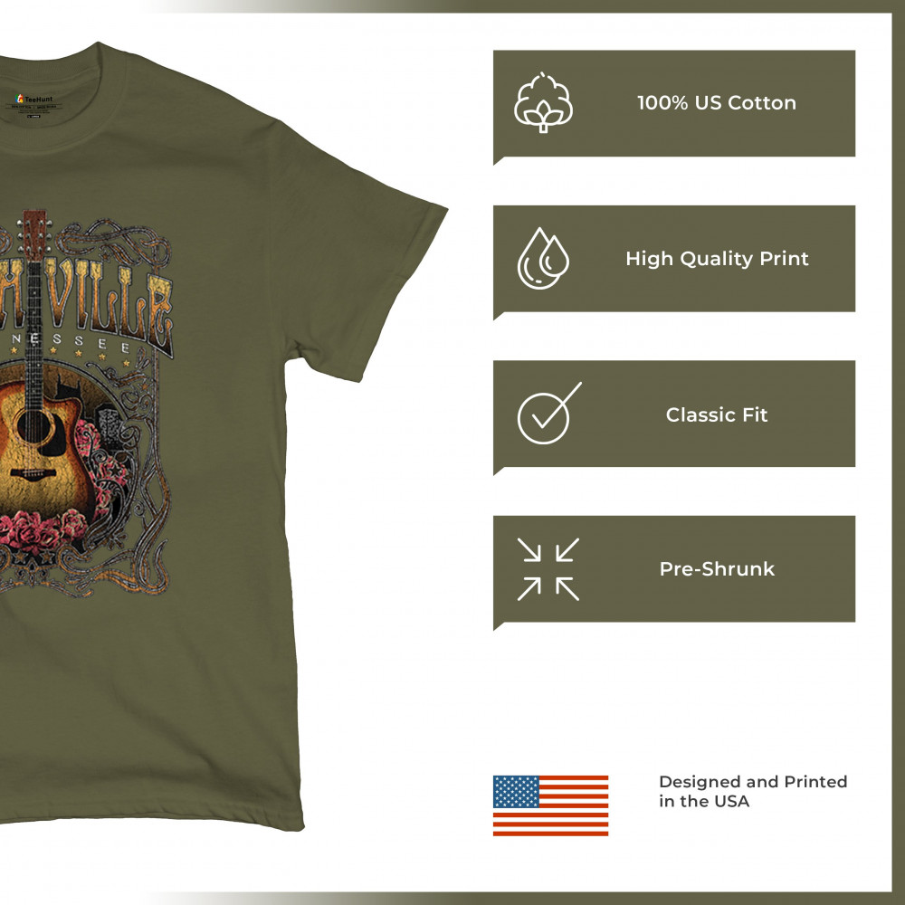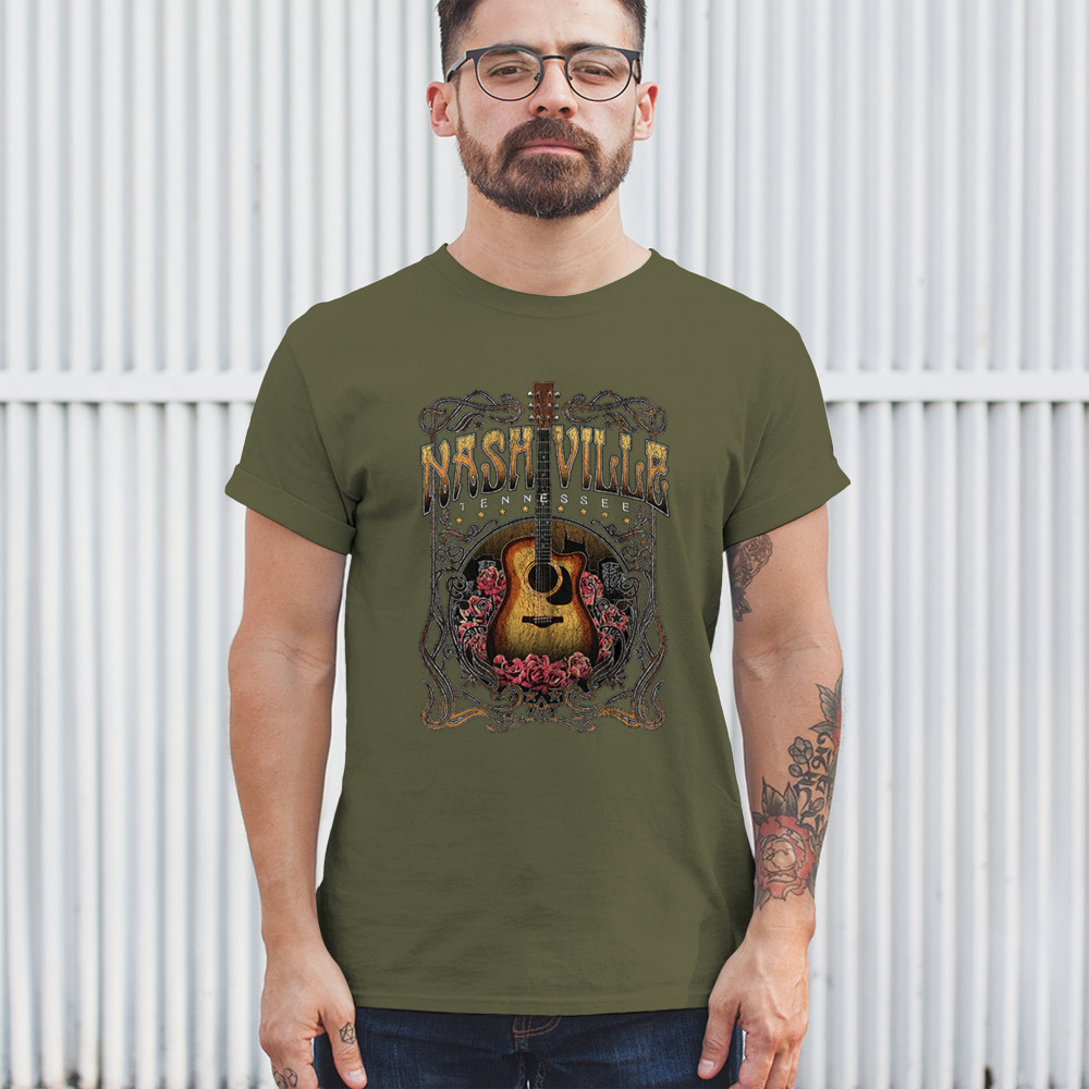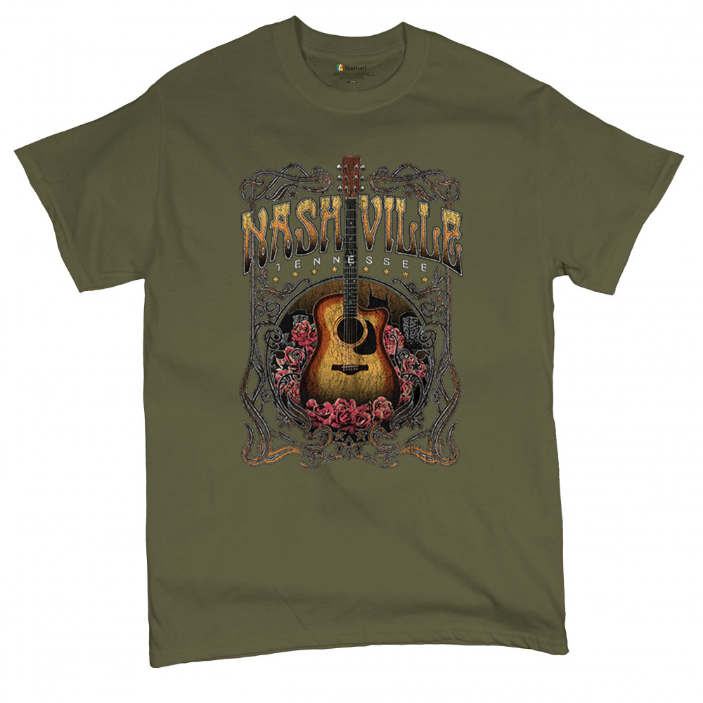 Vintage Nashville Tennessee design with rustic guitar and roses. Great for concerts, country music fans, road trips, and souvenir wear.