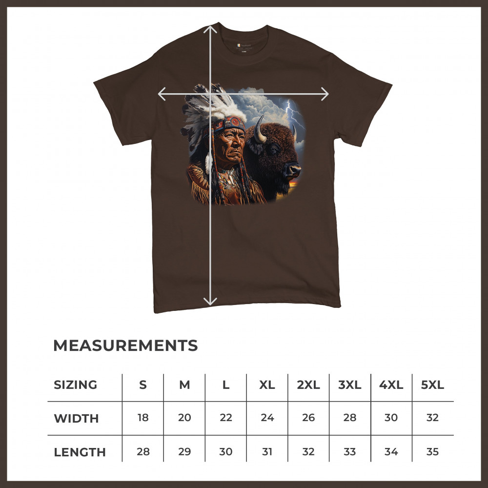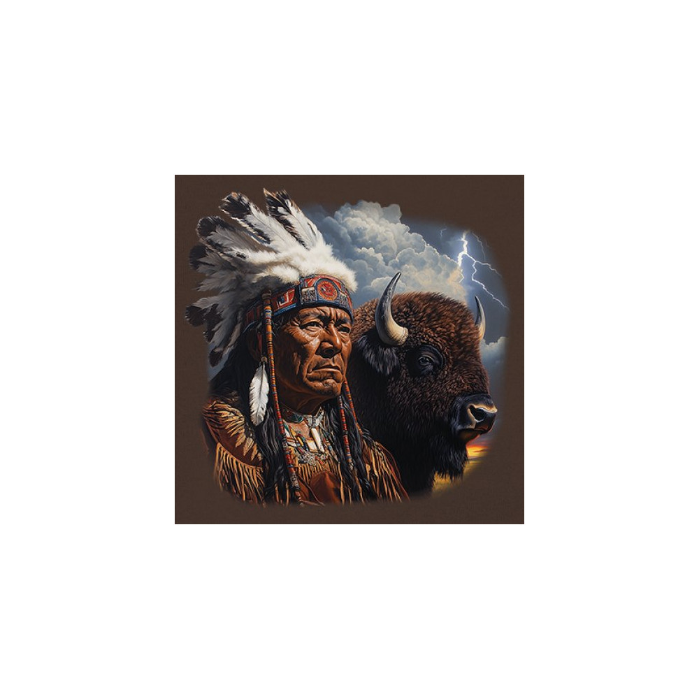 This powerful design features a Native American elder in traditional dress and feathered headdress beside a noble bison. Framed by a stormy sky and lightning, the art symbolizes tribal pride, spiritual harmony, ancestral strength, and a deep connection to nature’s raw energy.