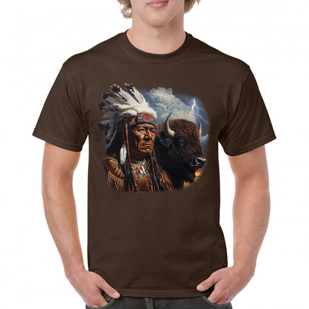 Bold tribal elder and bison design framed by lightning sky—honoring heritage, strength, resilience, and sacred connection to nature.