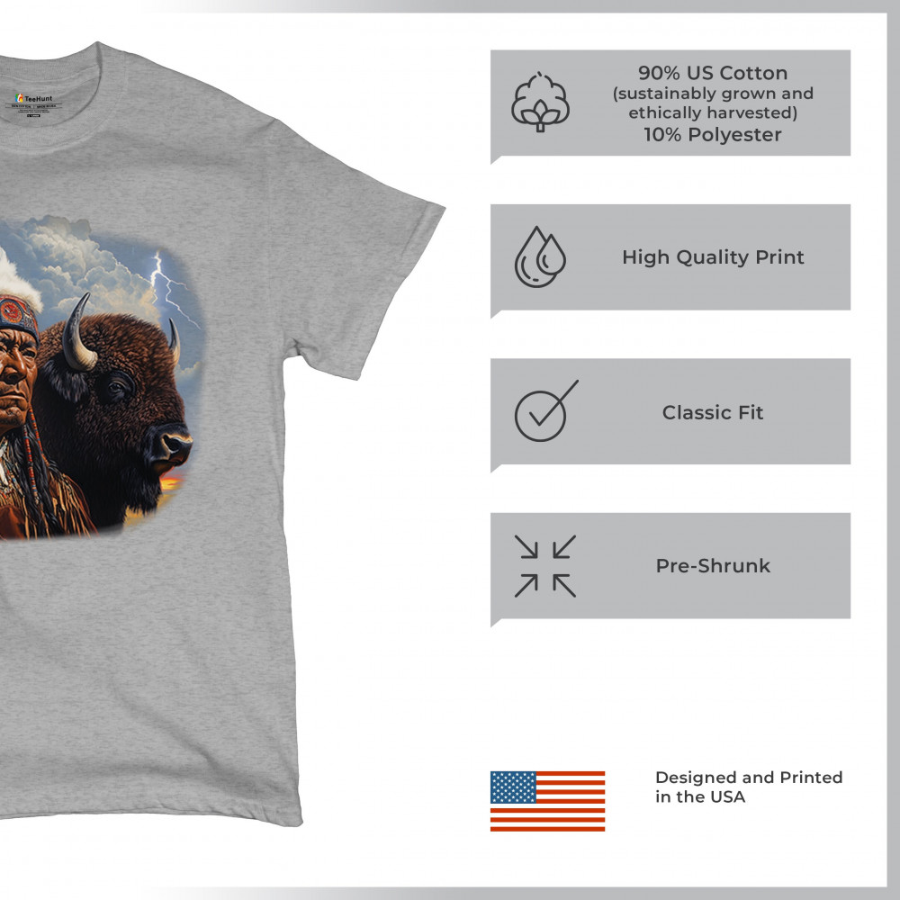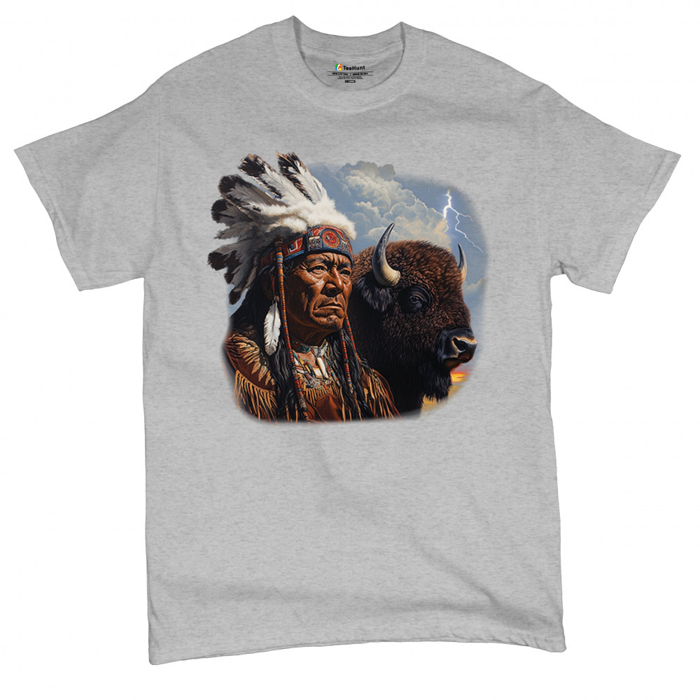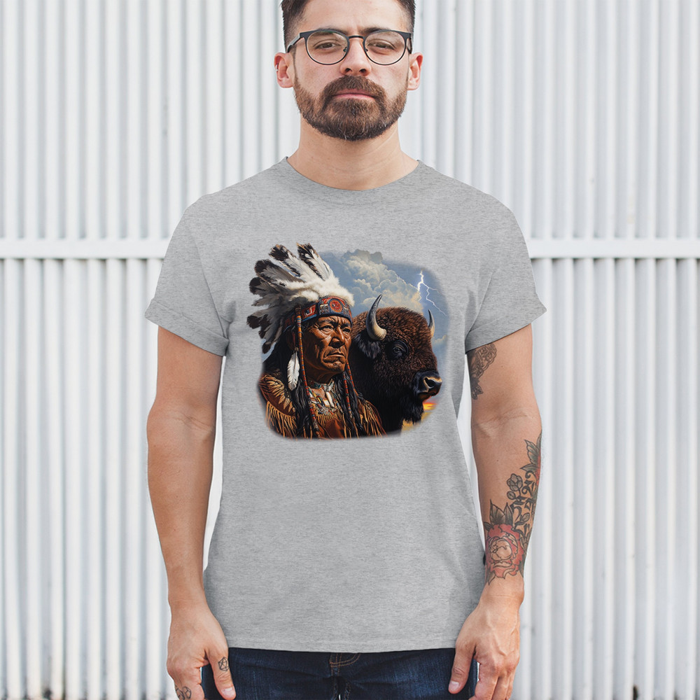 Bold tribal elder and bison design framed by lightning sky—honoring heritage, strength, resilience, and sacred connection to nature.