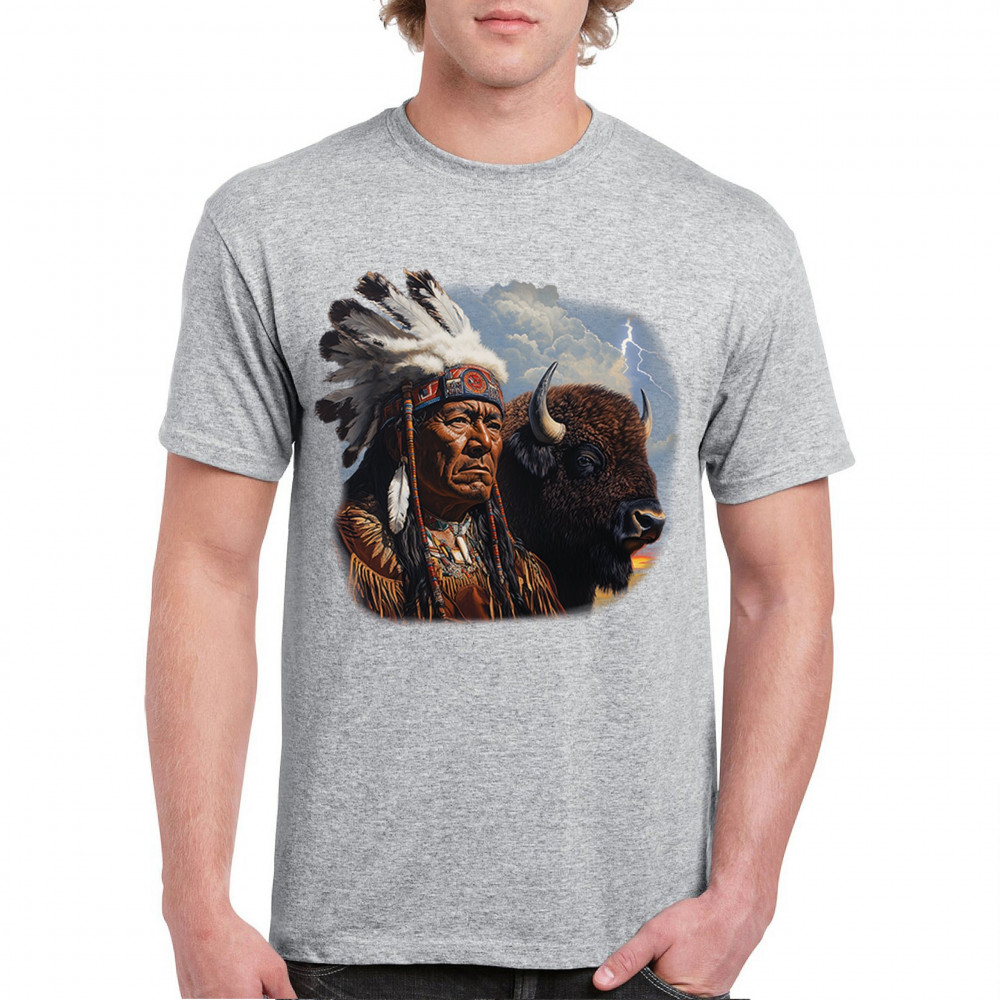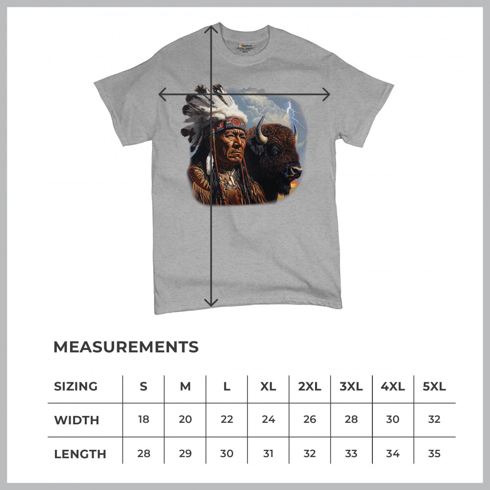 This powerful design features a Native American elder in traditional dress and feathered headdress beside a noble bison. Framed by a stormy sky and lightning, the art symbolizes tribal pride, spiritual harmony, ancestral strength, and a deep connection to nature’s raw energy.