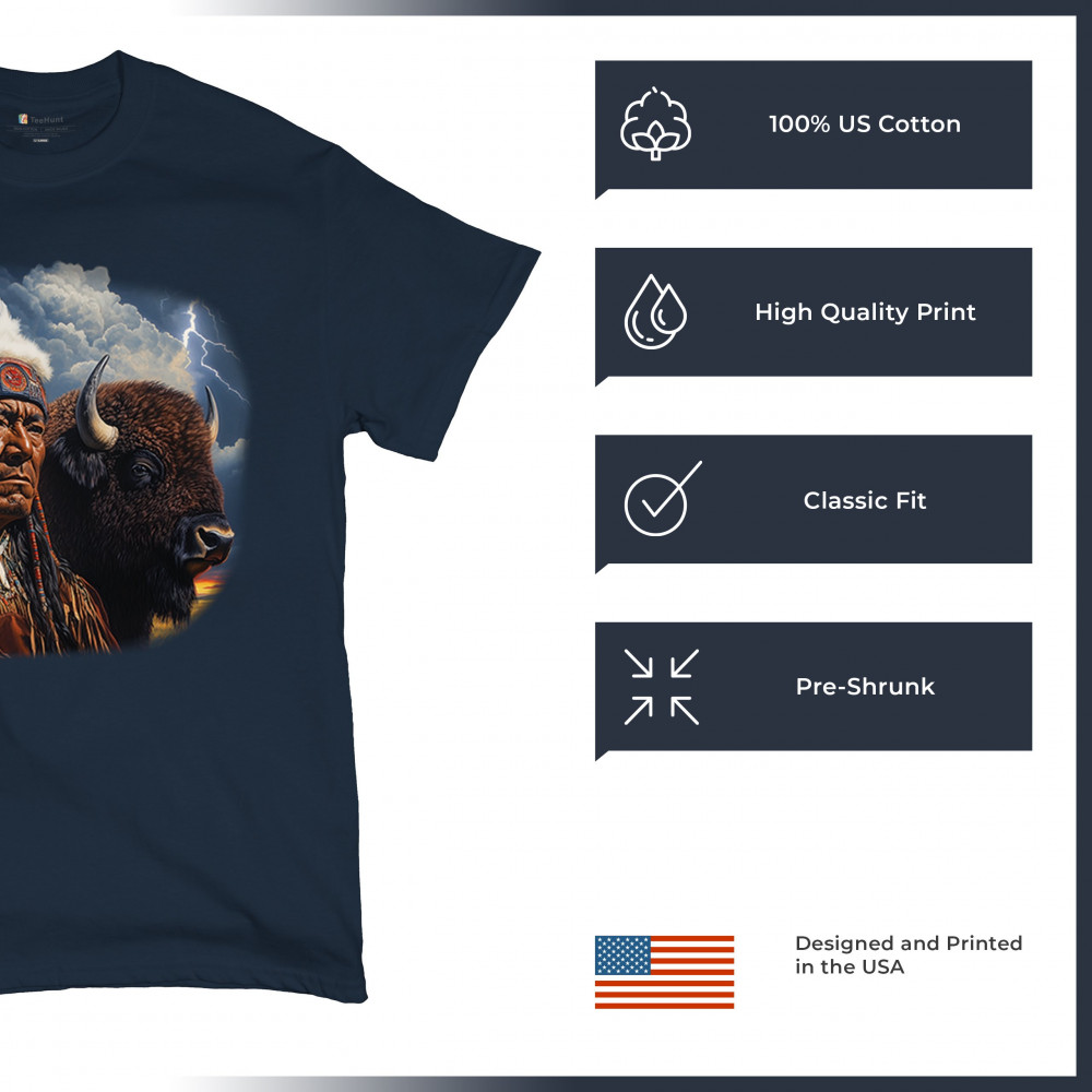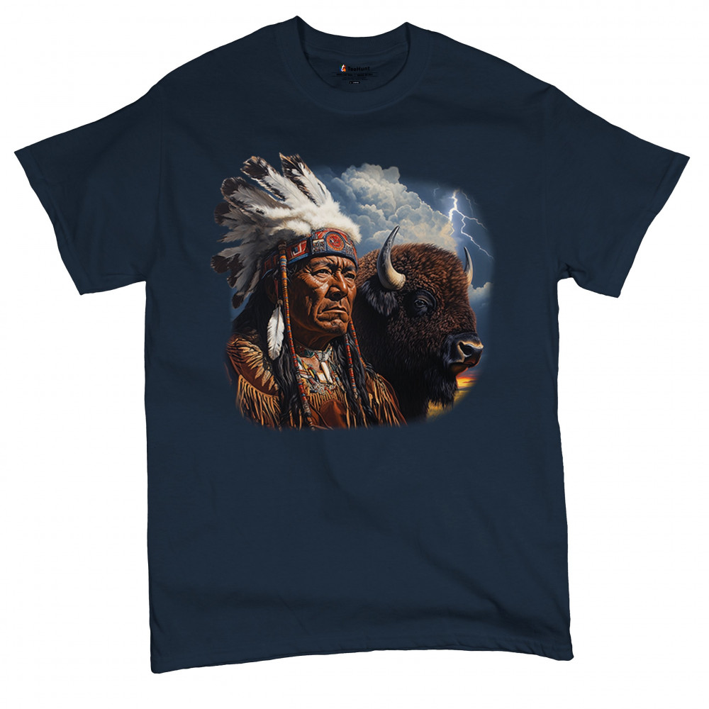 Bold tribal elder and bison design framed by lightning sky—honoring heritage, strength, resilience, and sacred connection to nature.