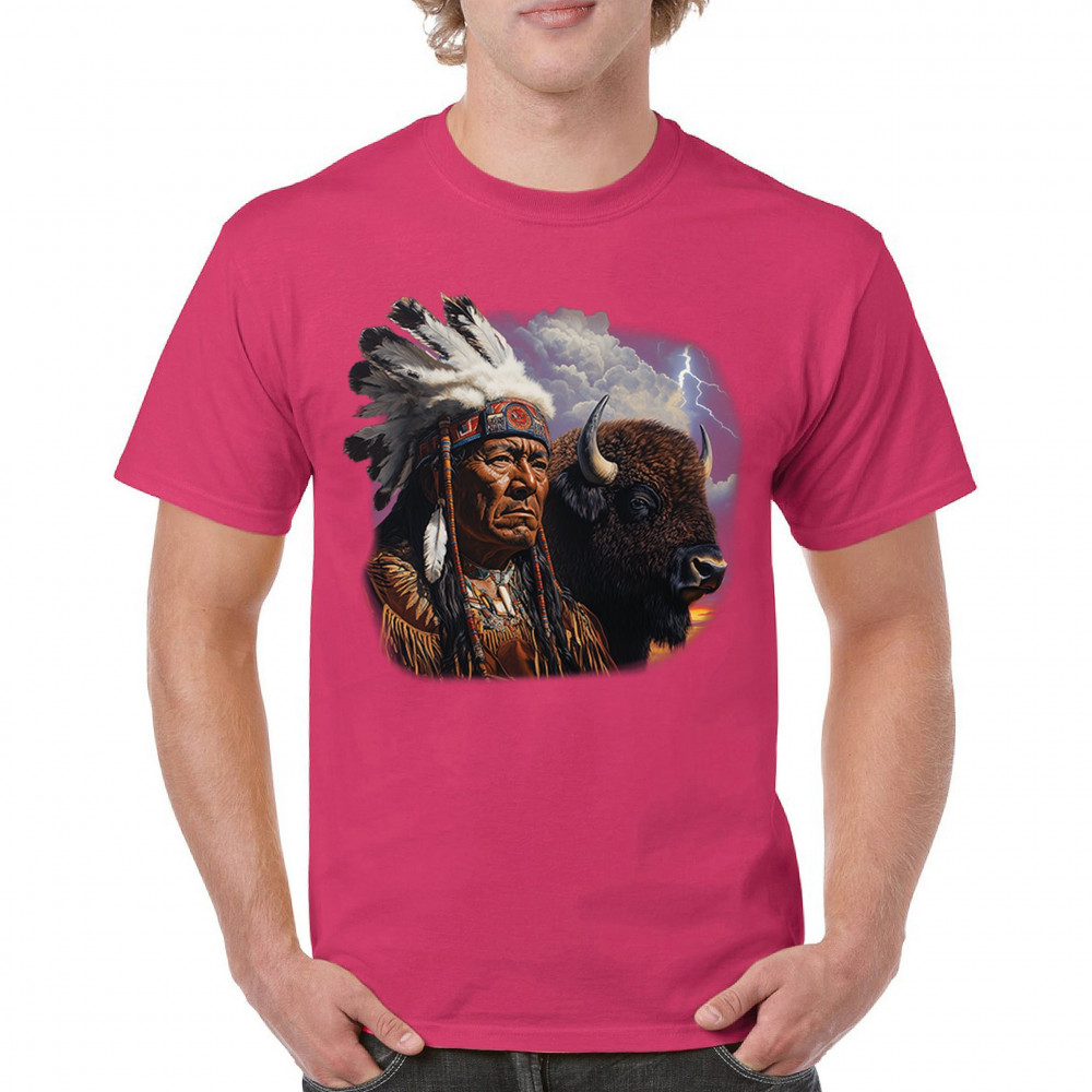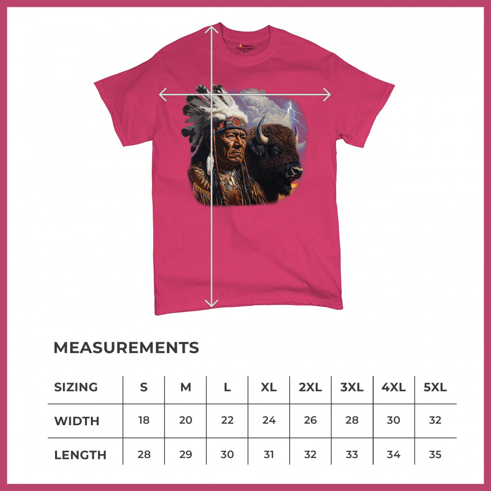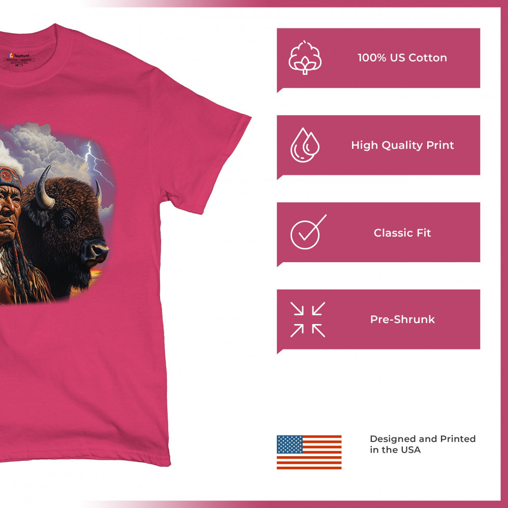 This powerful design features a Native American elder in traditional dress and feathered headdress beside a noble bison. Framed by a stormy sky and lightning, the art symbolizes tribal pride, spiritual harmony, ancestral strength, and a deep connection to nature’s raw energy.