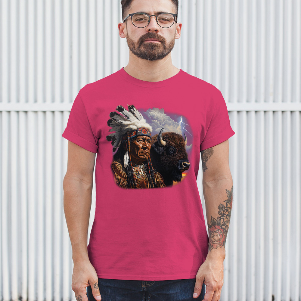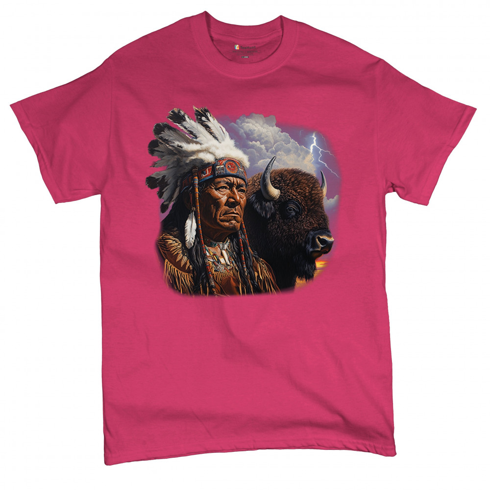 Bold tribal elder and bison design framed by lightning sky—honoring heritage, strength, resilience, and sacred connection to nature.