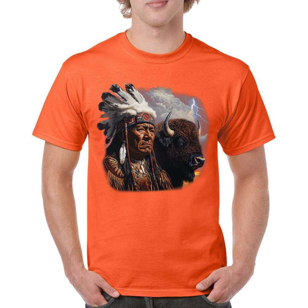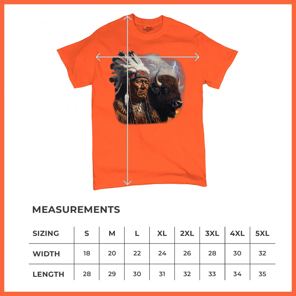 This powerful design features a Native American elder in traditional dress and feathered headdress beside a noble bison. Framed by a stormy sky and lightning, the art symbolizes tribal pride, spiritual harmony, ancestral strength, and a deep connection to nature’s raw energy.