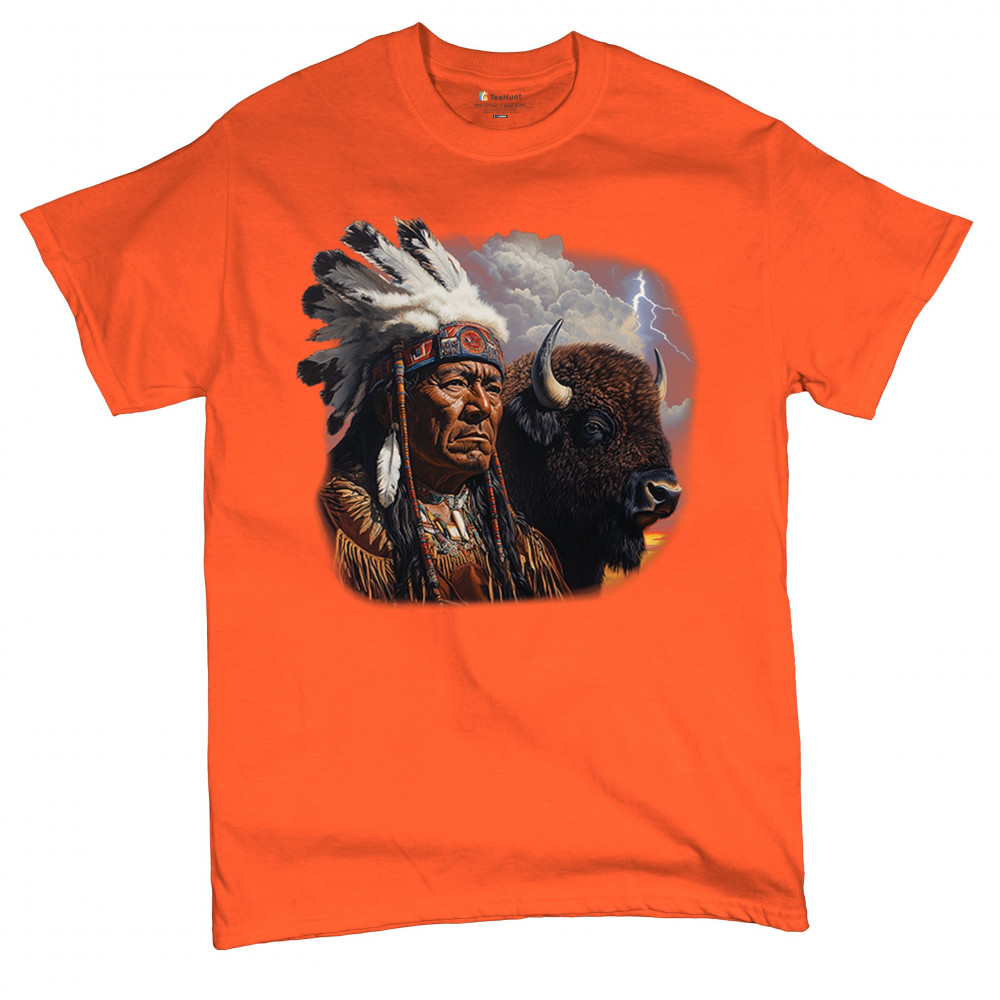 Bold tribal elder and bison design framed by lightning sky—honoring heritage, strength, resilience, and sacred connection to nature.