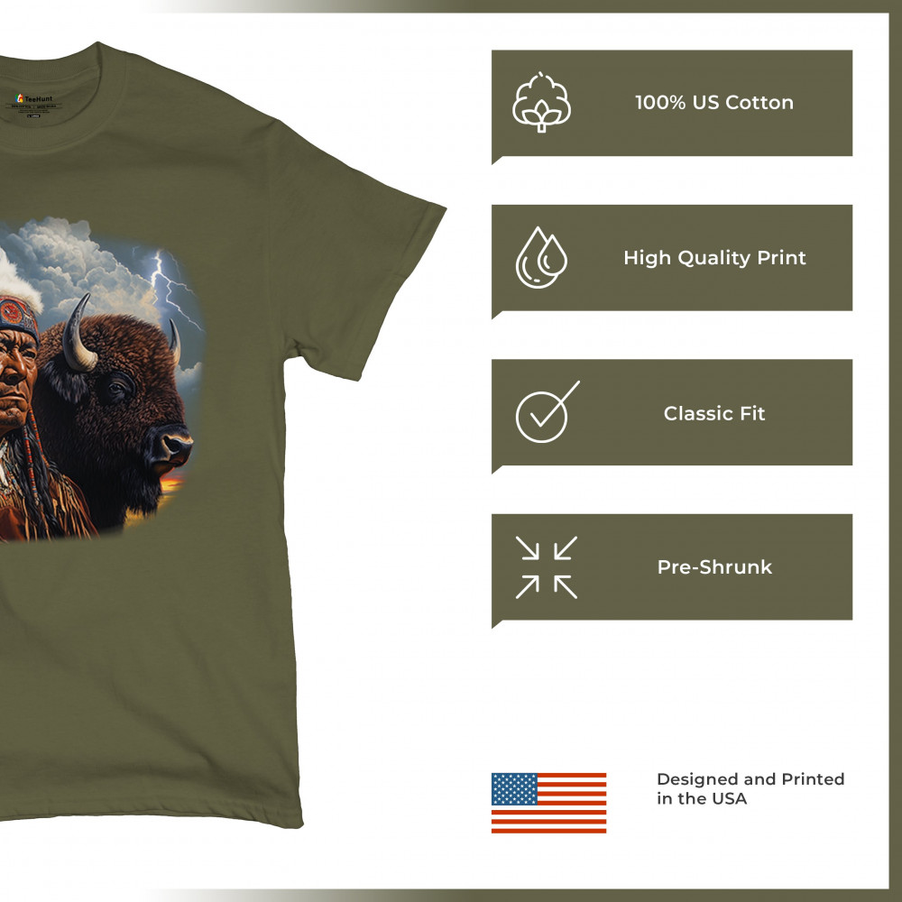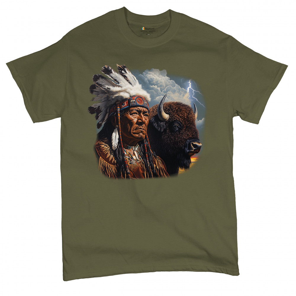 Bold tribal elder and bison design framed by lightning sky—honoring heritage, strength, resilience, and sacred connection to nature.
