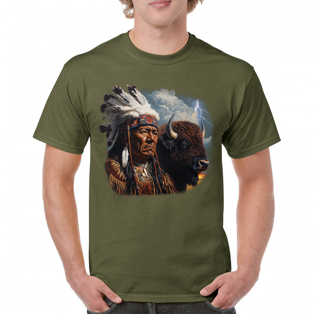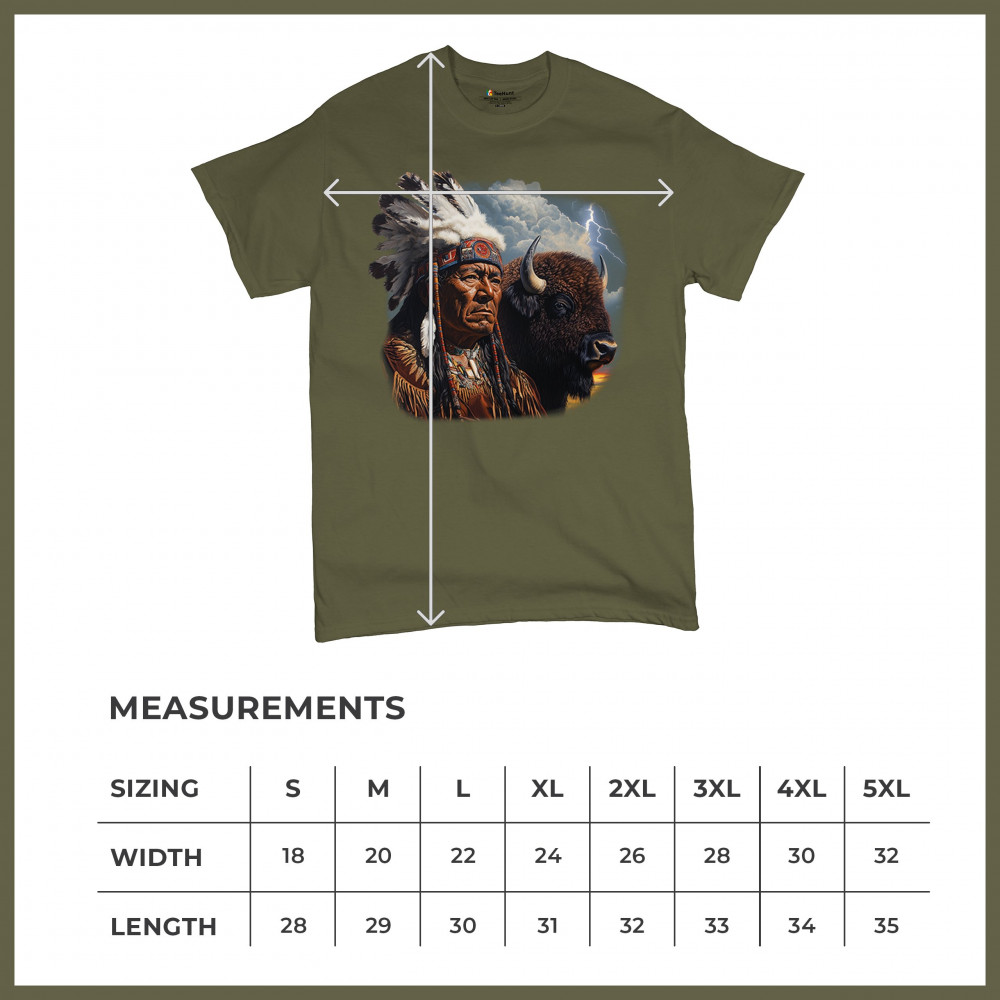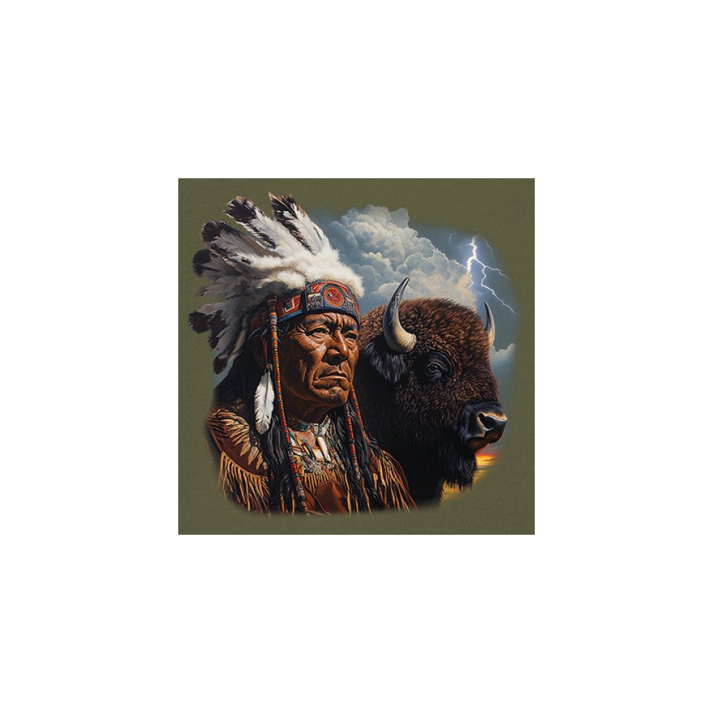 This powerful design features a Native American elder in traditional dress and feathered headdress beside a noble bison. Framed by a stormy sky and lightning, the art symbolizes tribal pride, spiritual harmony, ancestral strength, and a deep connection to nature’s raw energy.
