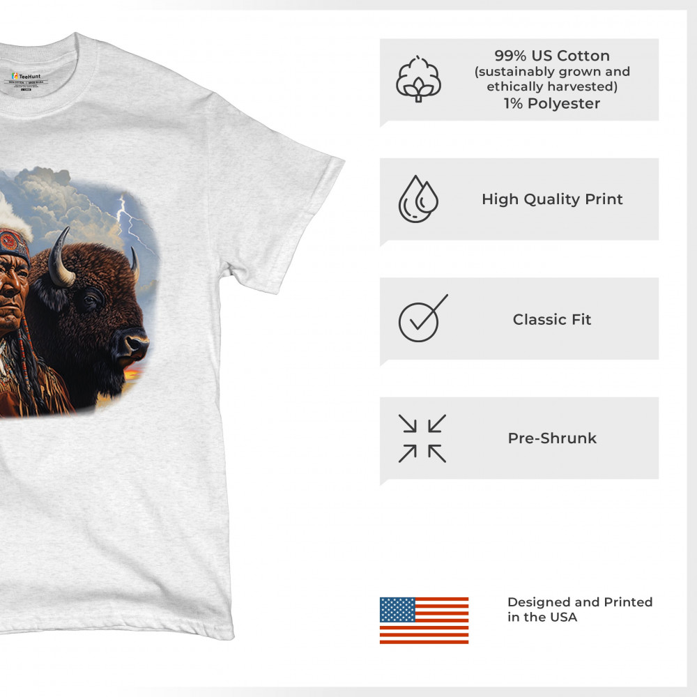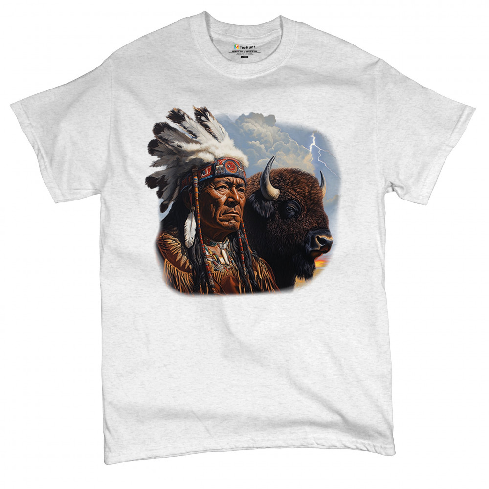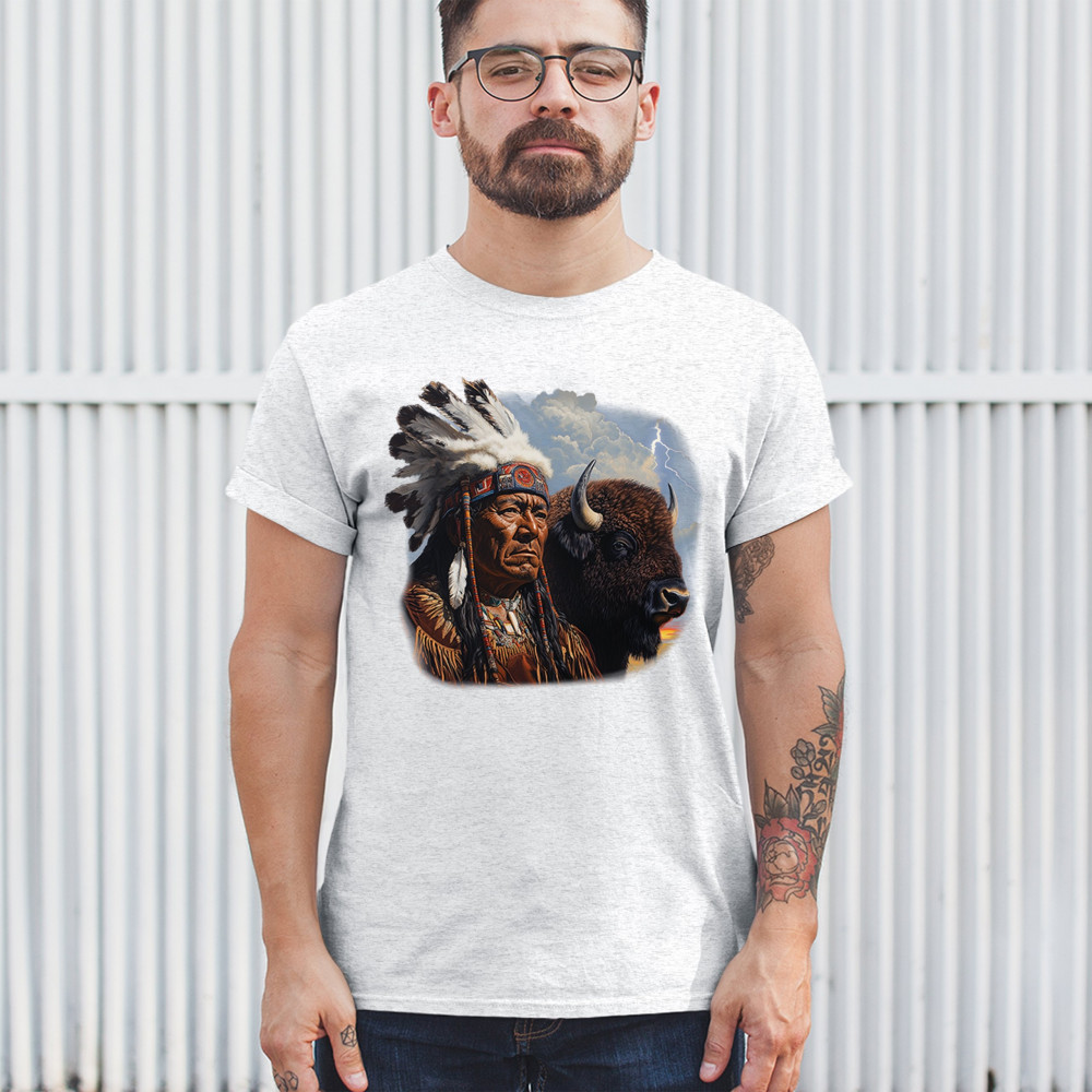 Bold tribal elder and bison design framed by lightning sky—honoring heritage, strength, resilience, and sacred connection to nature.